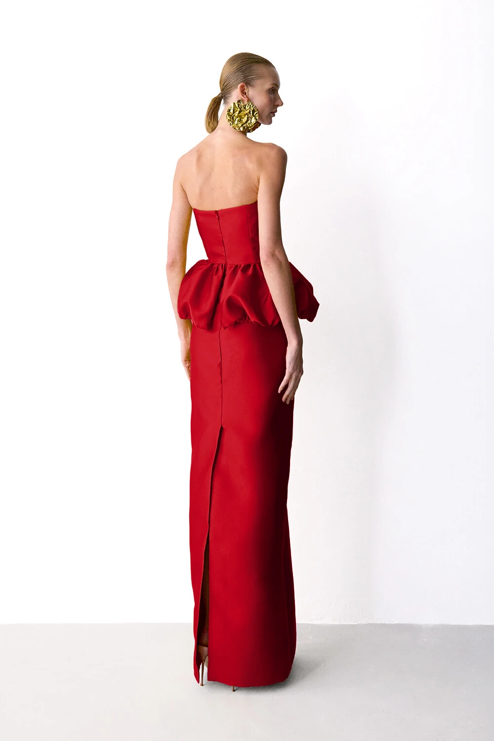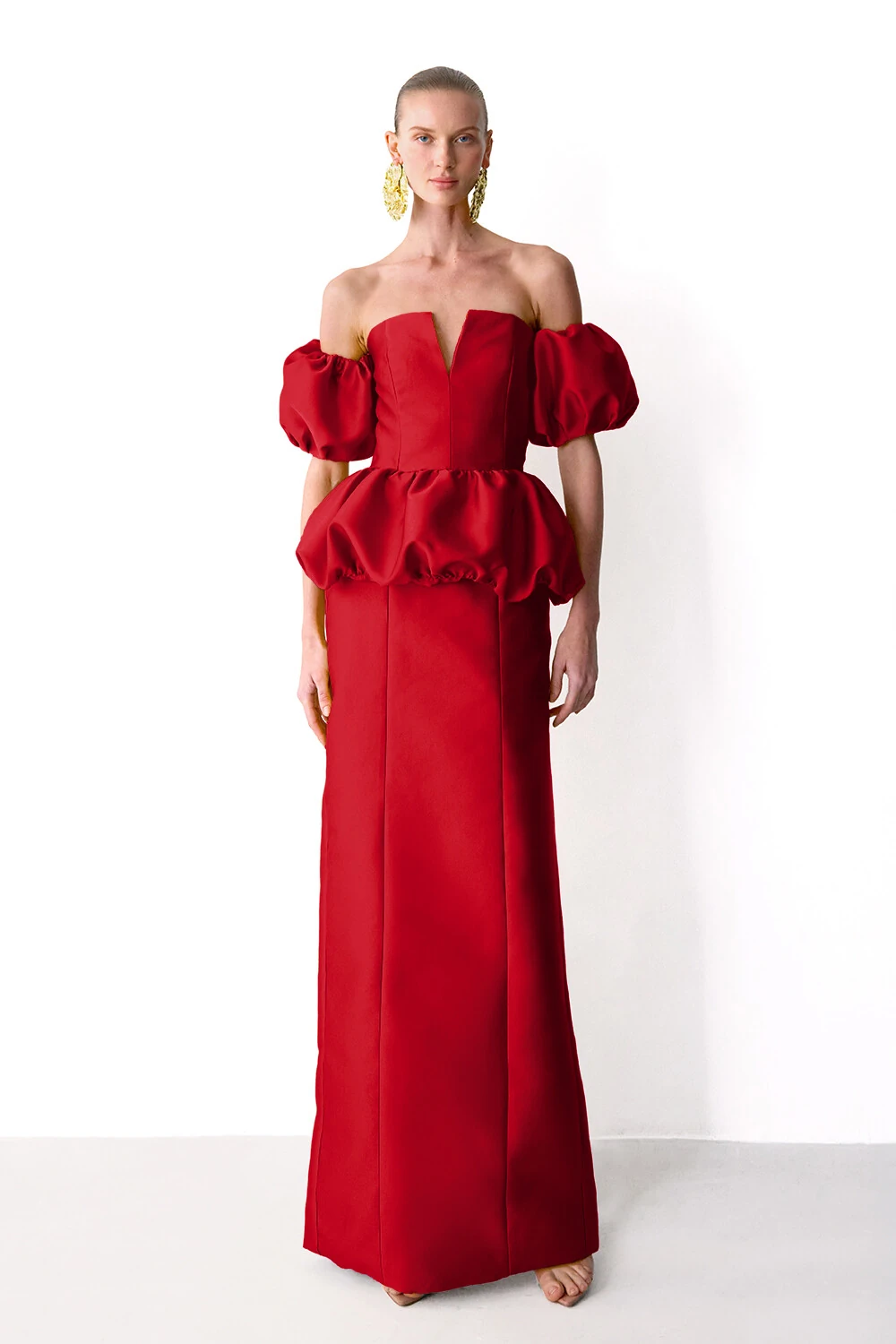 Vestido longo em zibeline com corpete com devote reto e detalhe em V, saia com peplum balone e saia com shape reto. Acompanha mangas bufantes em zibeline.