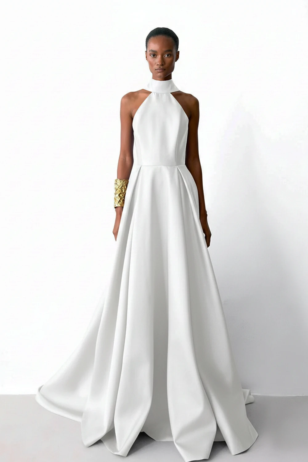 Vestido longo em zibeline com parte superior frente única com gola estruturada e que se transforma em uma lapela nas costas. Saia ampla e com volume com pregas profundas na frente e nas costas.