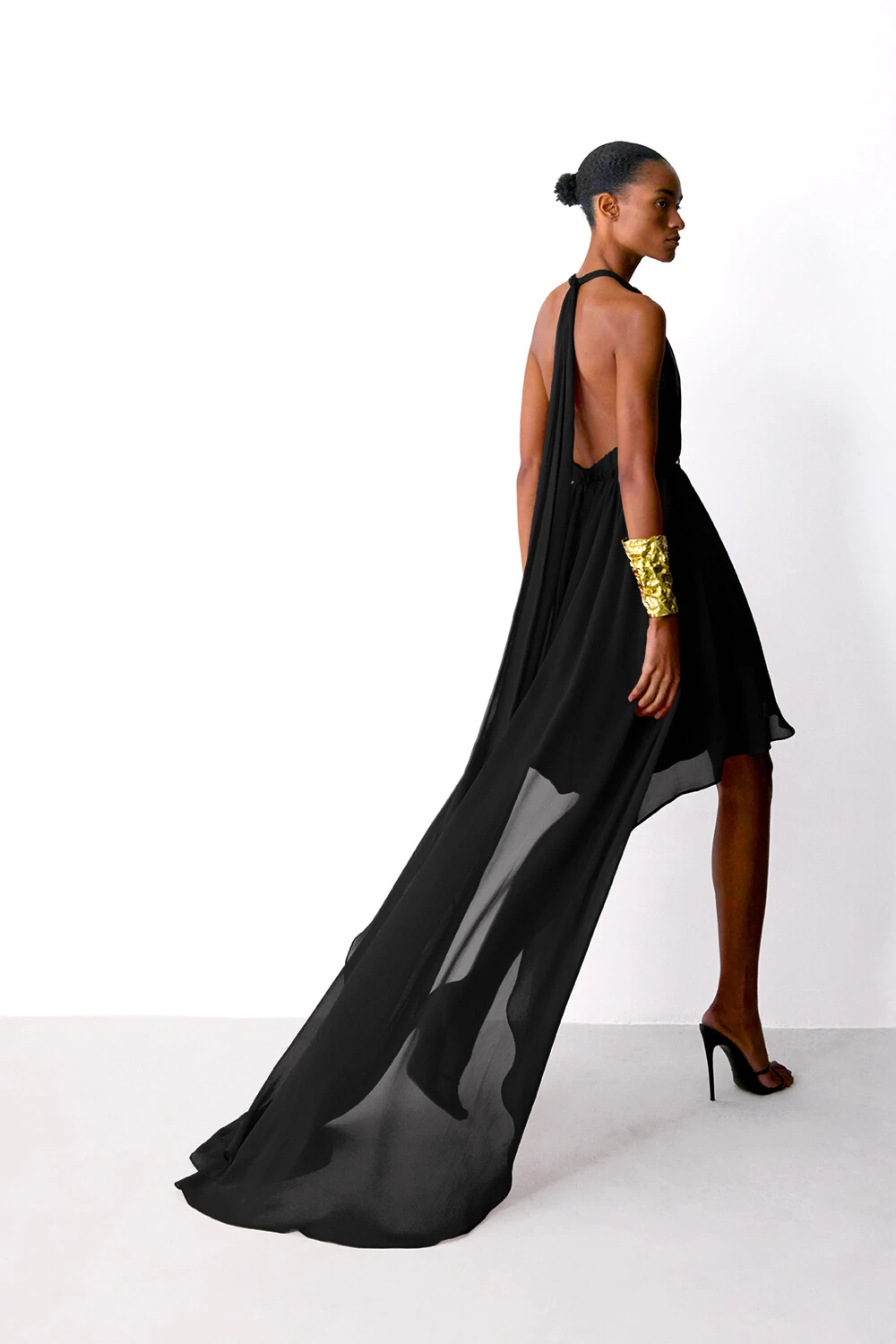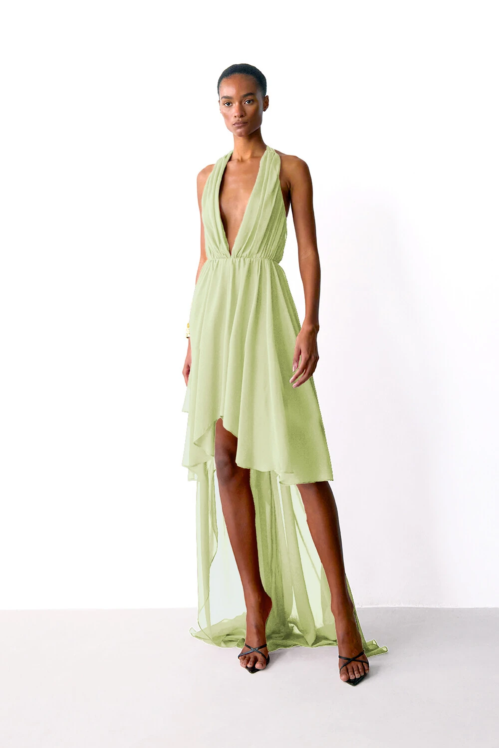Vestido em chiffon com parte superior com devote V profundo e amarracao nas costas e corpo todo drapeado. Saia mulet com franzido na cintura, com volume amplo e fluído.
