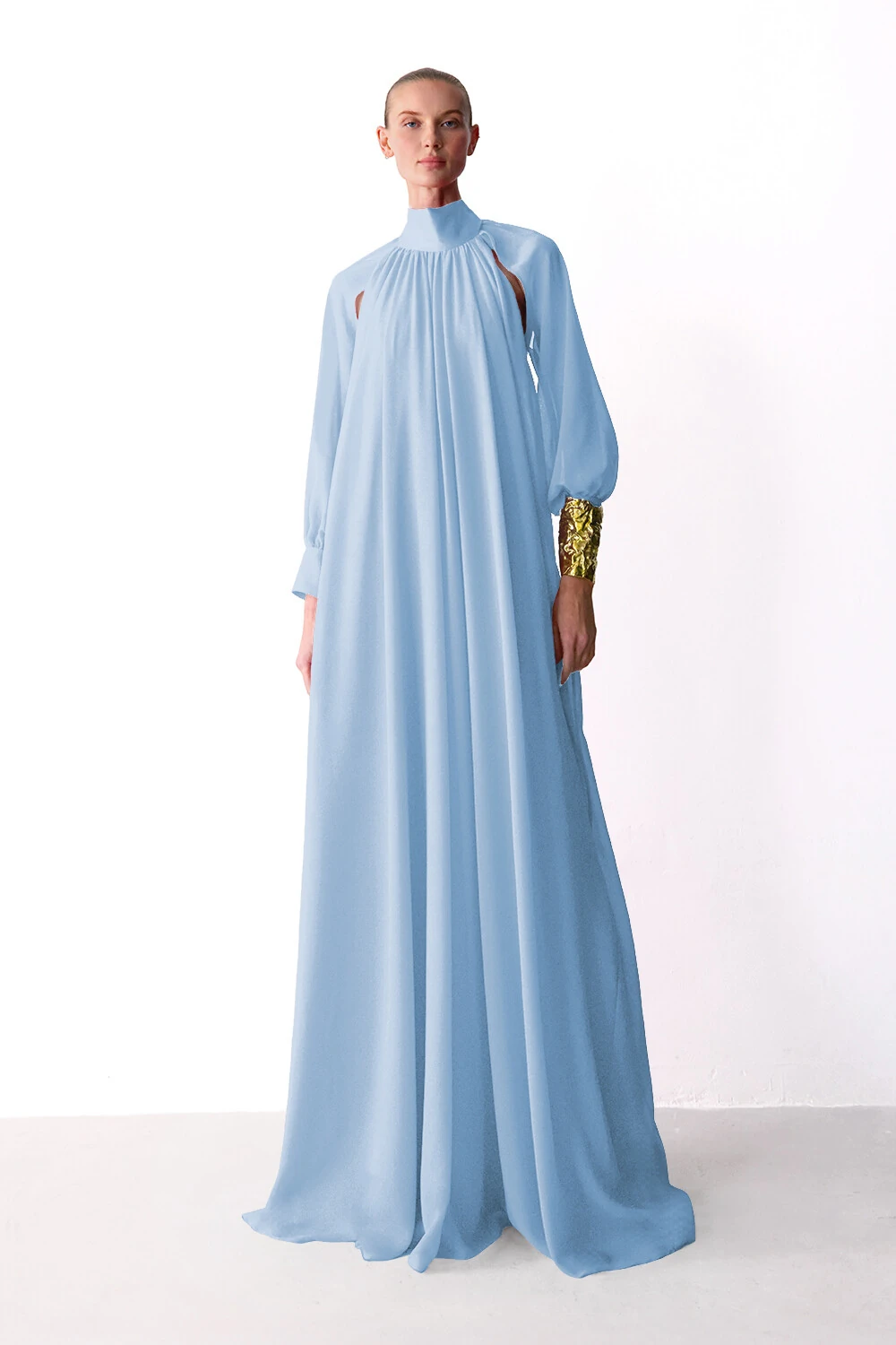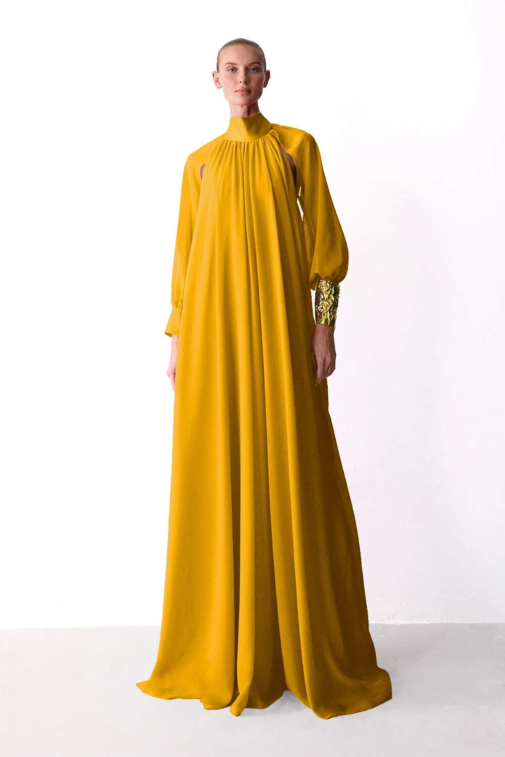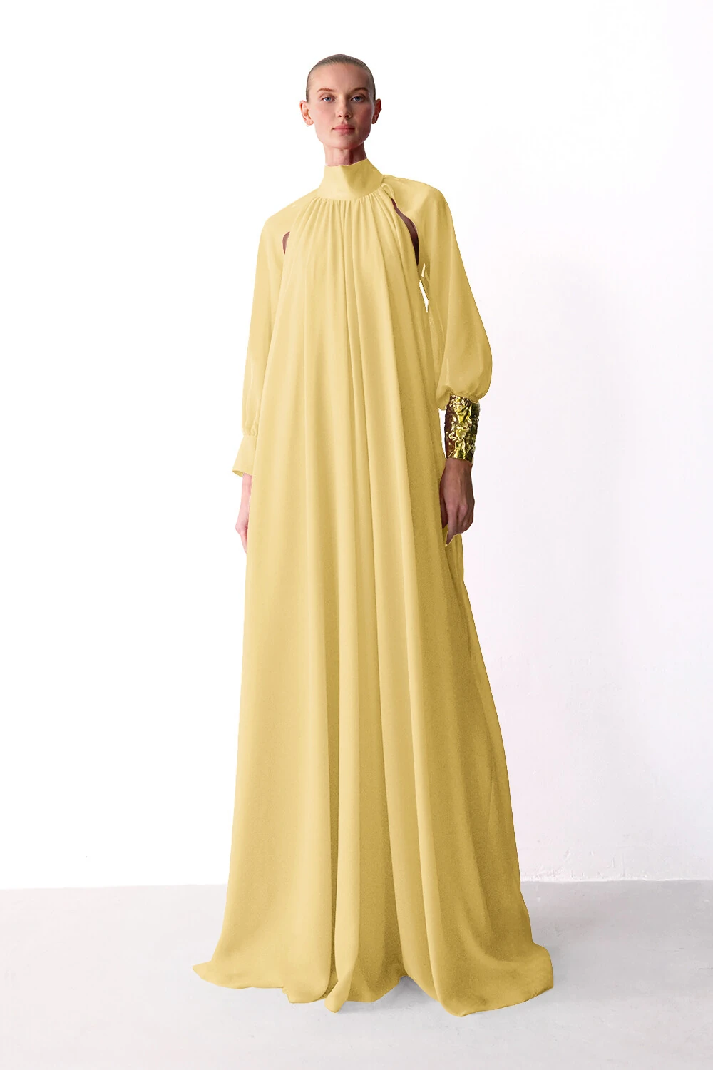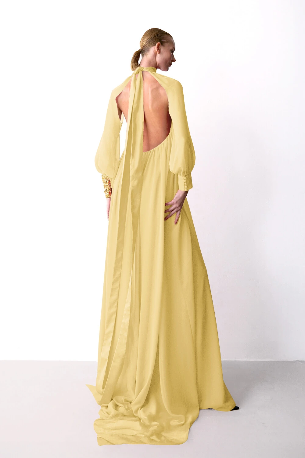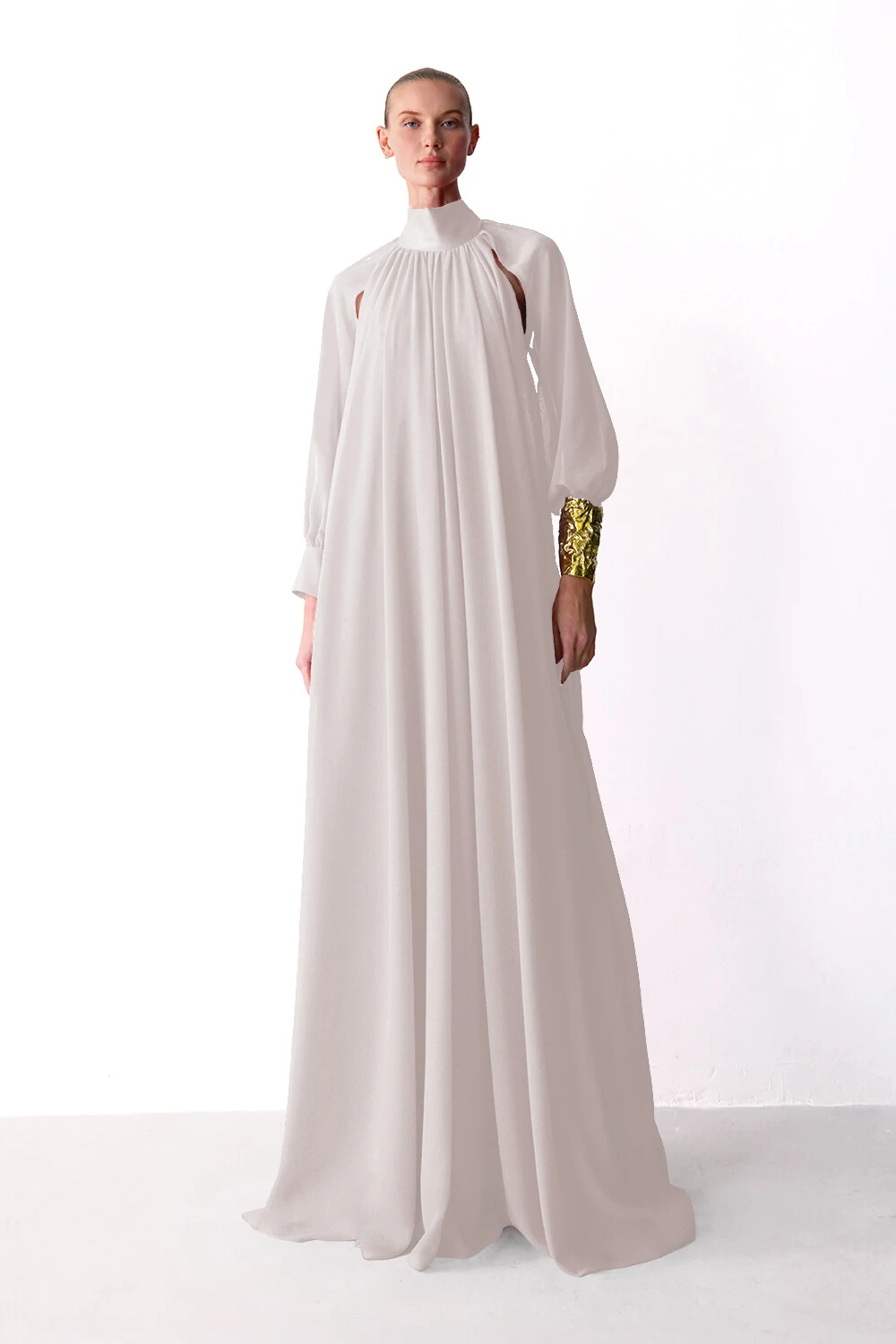Vestido longo todo confeccionado em georgete, com um shape amplo e fluído, tem uma gola alta formado por faixa de amarracao nas costas. Cavado na leteral e com decote baixo nas costas. Acompanha mangas removiveis tambem em georgete.