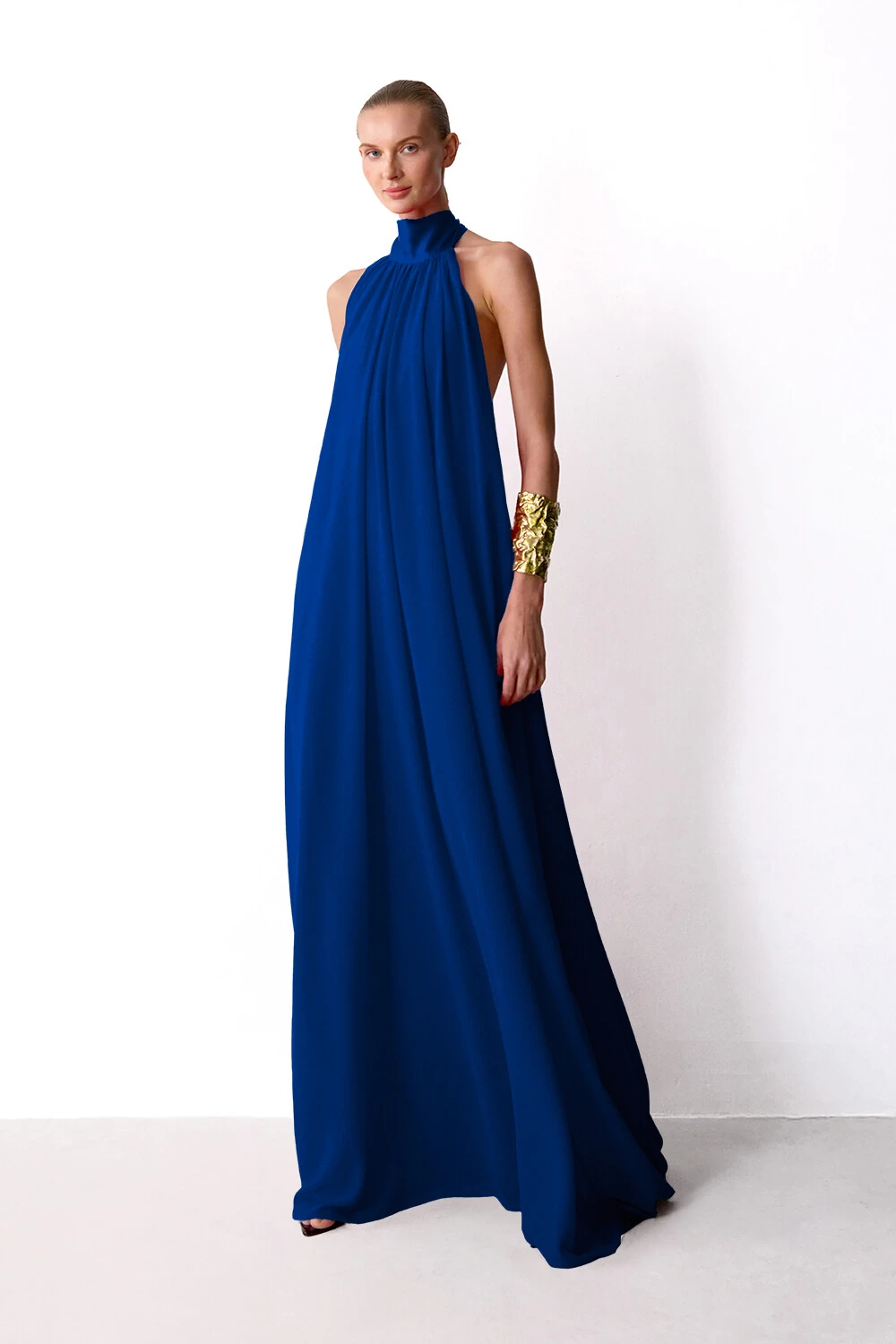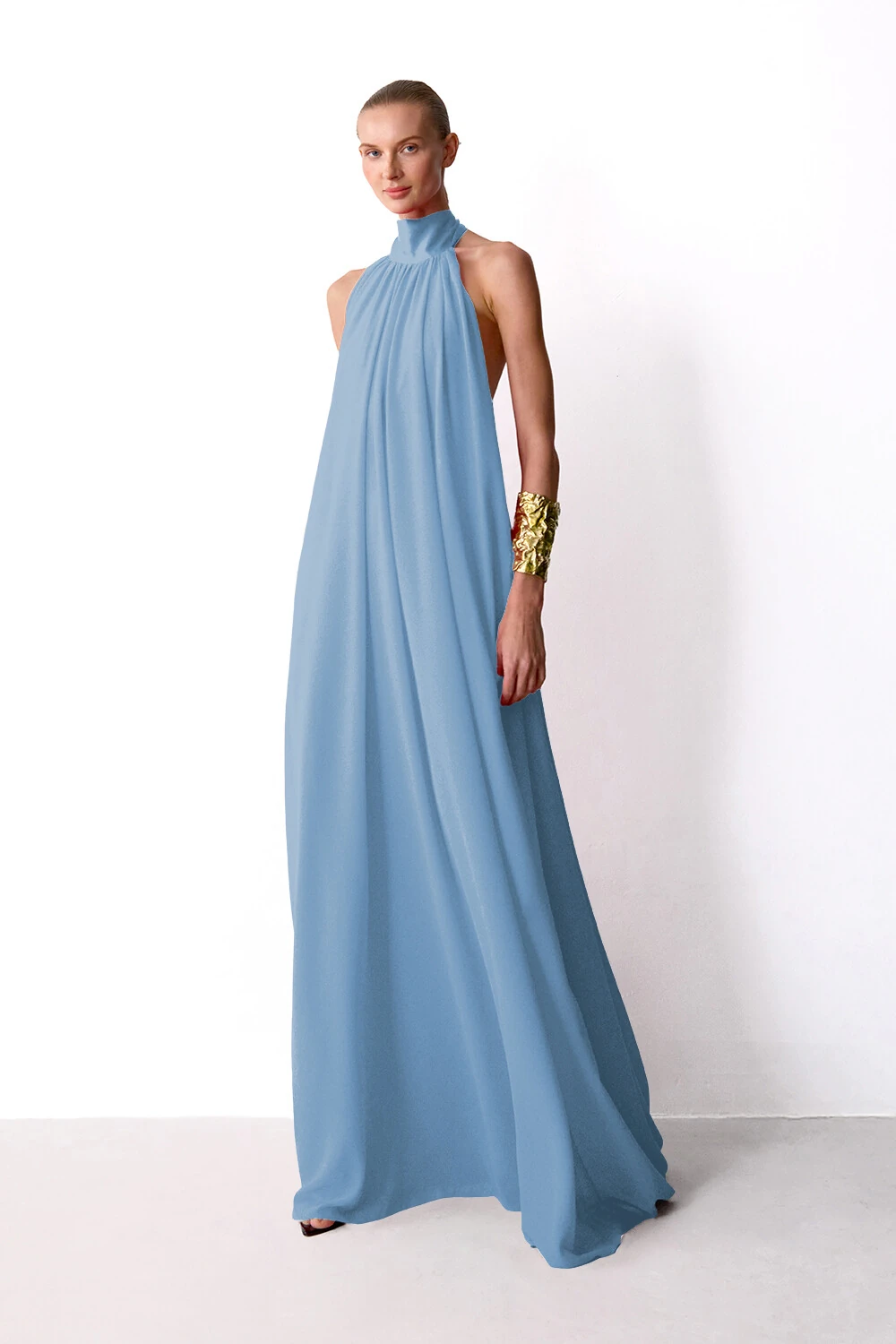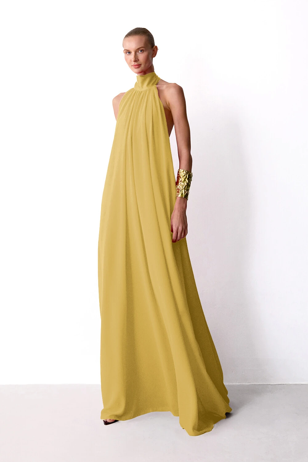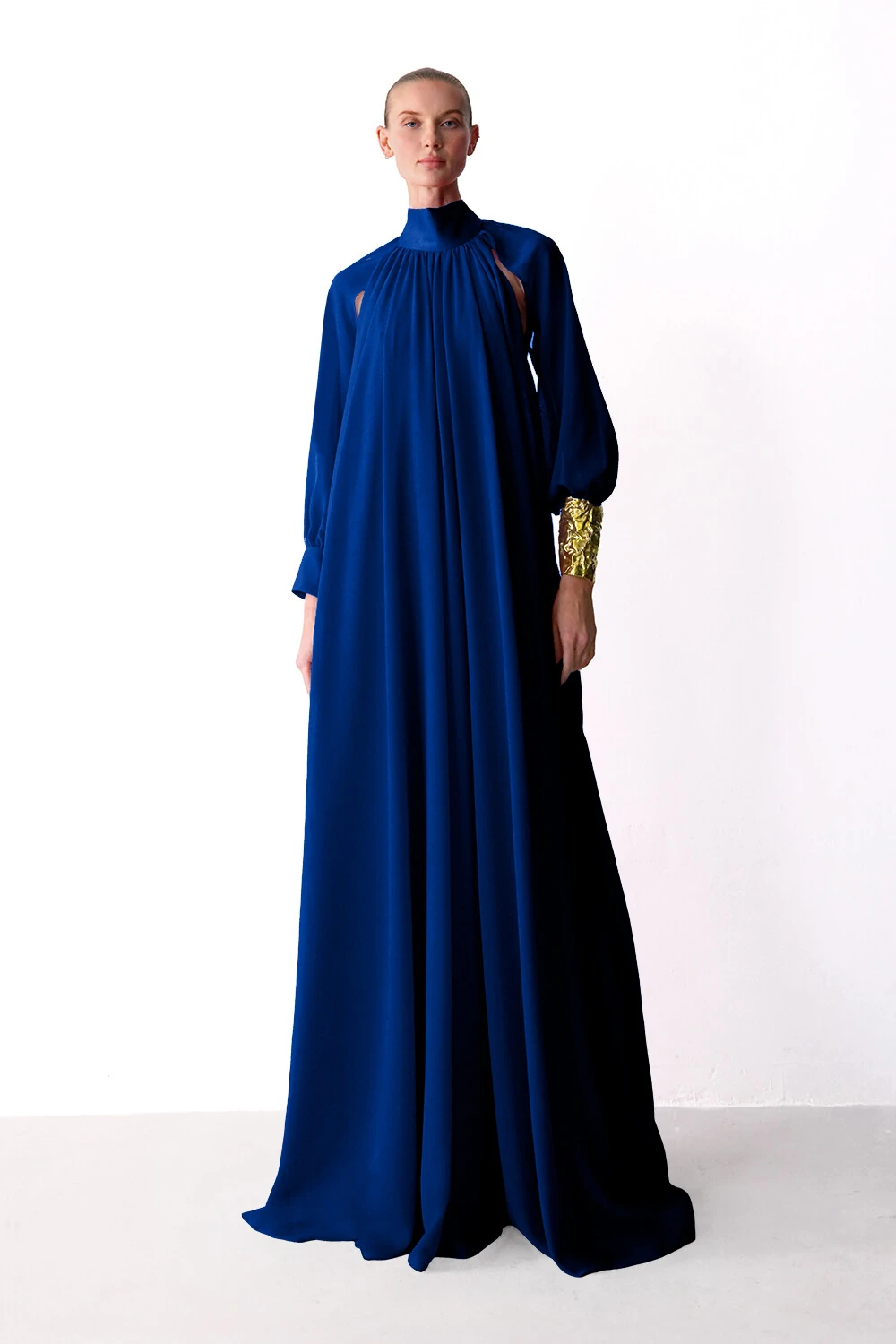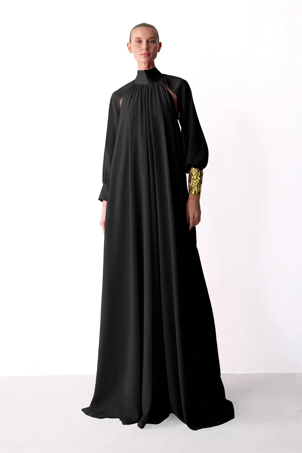 Vestido longo todo confeccionado em georgete, com um shape amplo e fluído, tem uma gola alta formado por faixa de amarracao nas costas. Cavado na leteral e com decote baixo nas costas. Acompanha mangas removiveis tambem em georgete.
