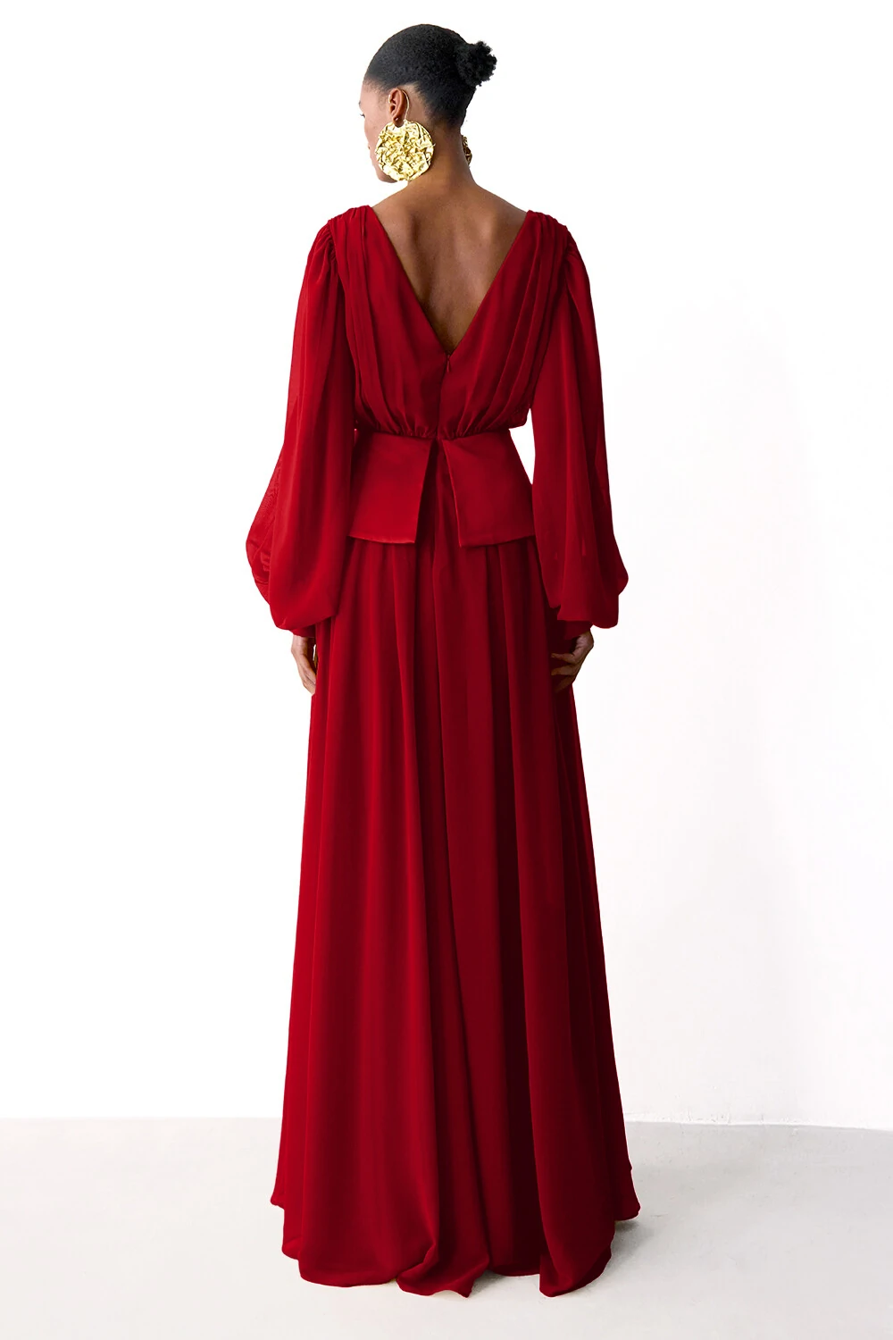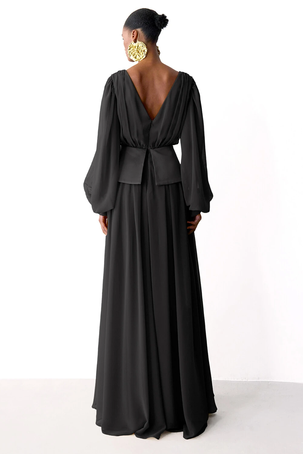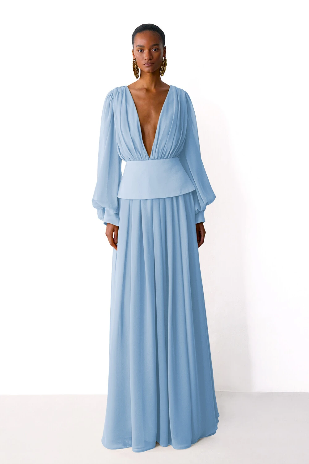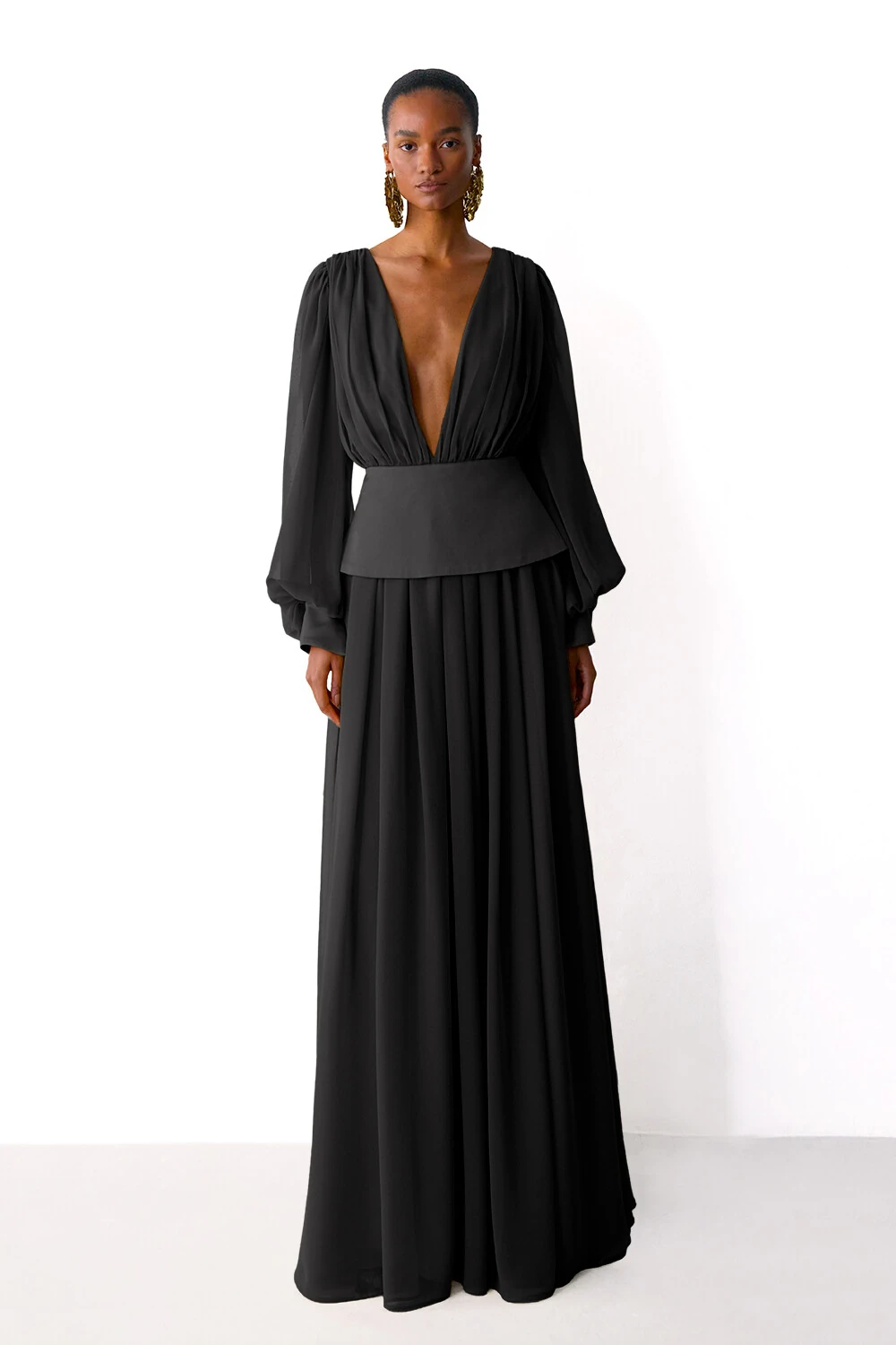 Vestido longo em musseline, com decote em V profundo, tem o busto drapeado com mangas bufantes e punhos em crepe estruturado. Na cintura, peplum em crepe estruturado e saia franzida na cintura com volume e fluídes.