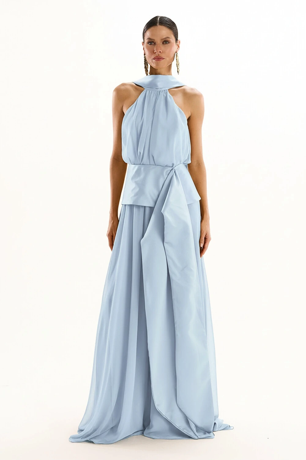 Vestido longo em musseline, com parte superior em frente única com uma gola alta em crepe, que se transforma em lapela nas costas. Saia franzida na cintura, amplitude e fluídes. Acompamha uma maxi pala em crepe estruturado.