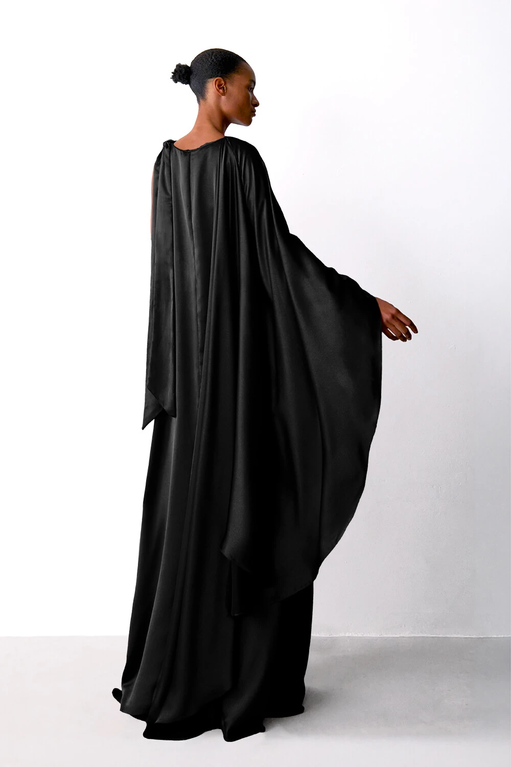 Vestido Longo em cetim com parte superior em decote levemen te canoa, amarracao com faixas longas no ombro esquerdo e manga ampla e fluída do lado direito, que se tranforma em uma capa nas costas. Saia ampla com fenda transpassada na fente.