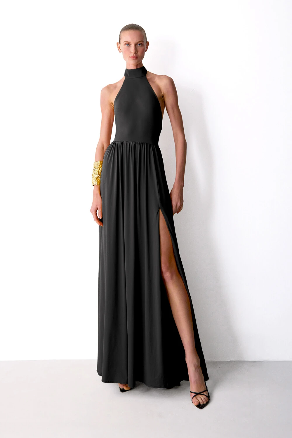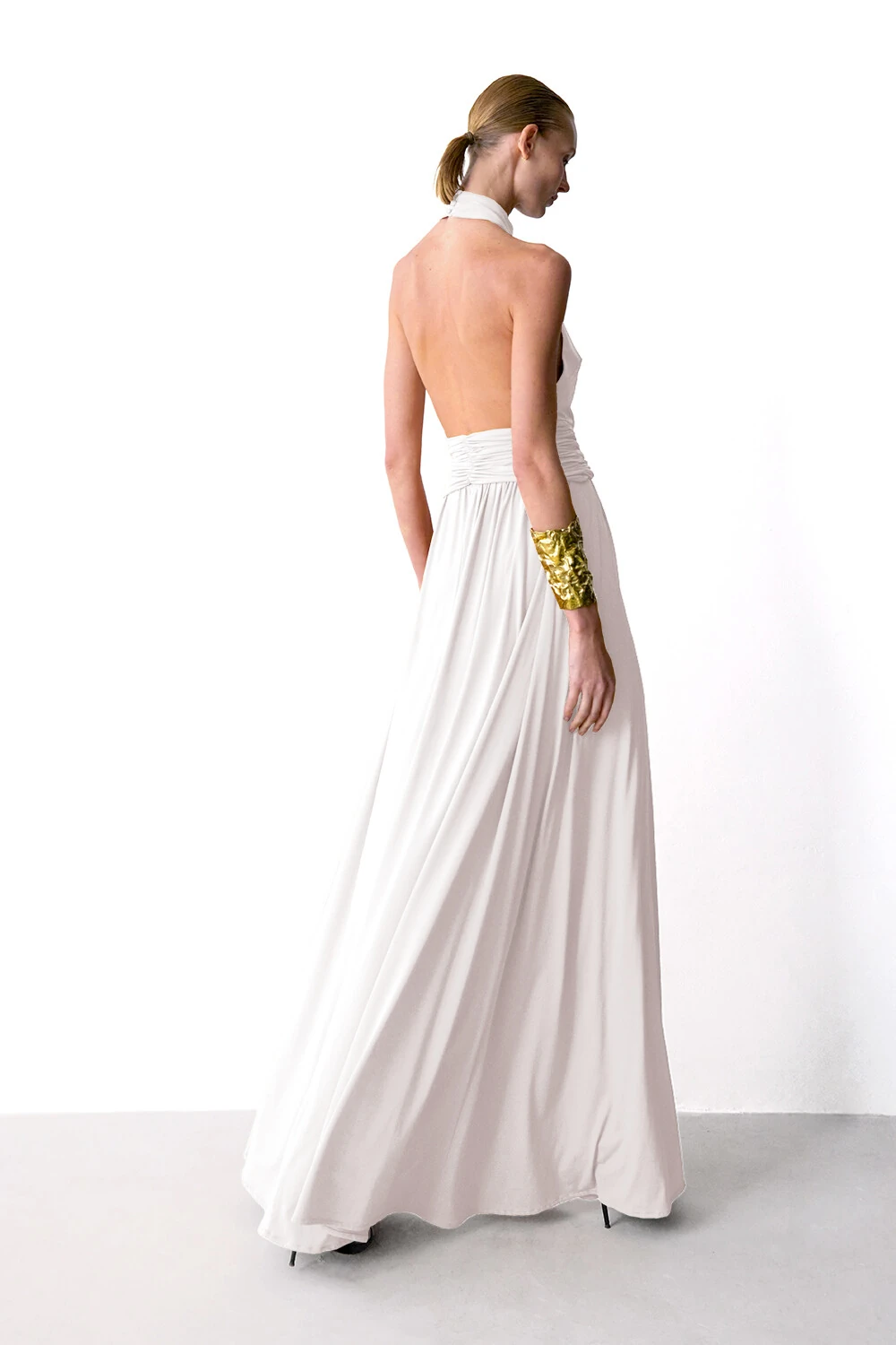 Vestido longo em malha super leve e ajustavél ao corpo, com parte superior com decote frente única. Saia ampla e franzida na cintura com fenda frontale e faixa removivel drapeada para cintura.
