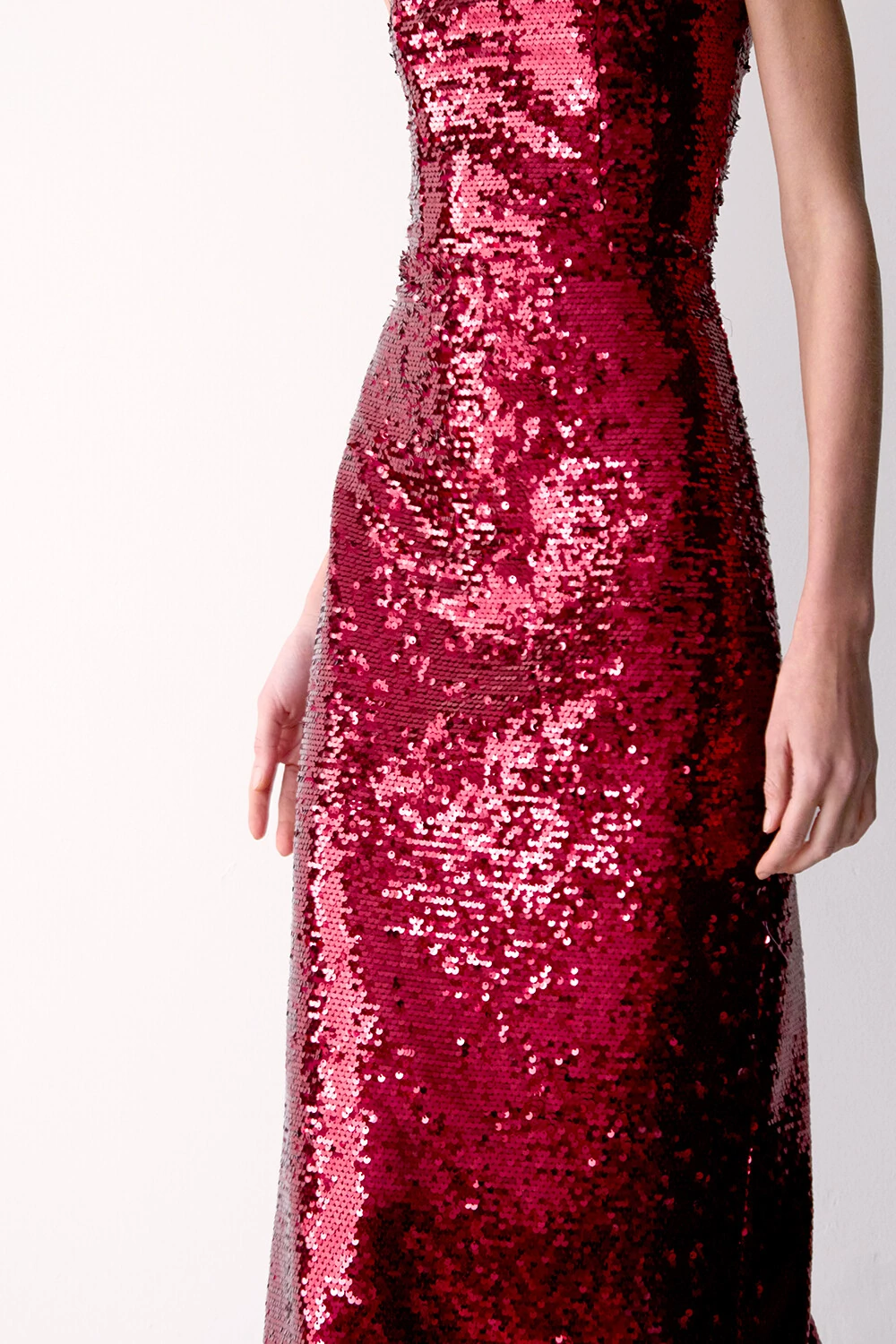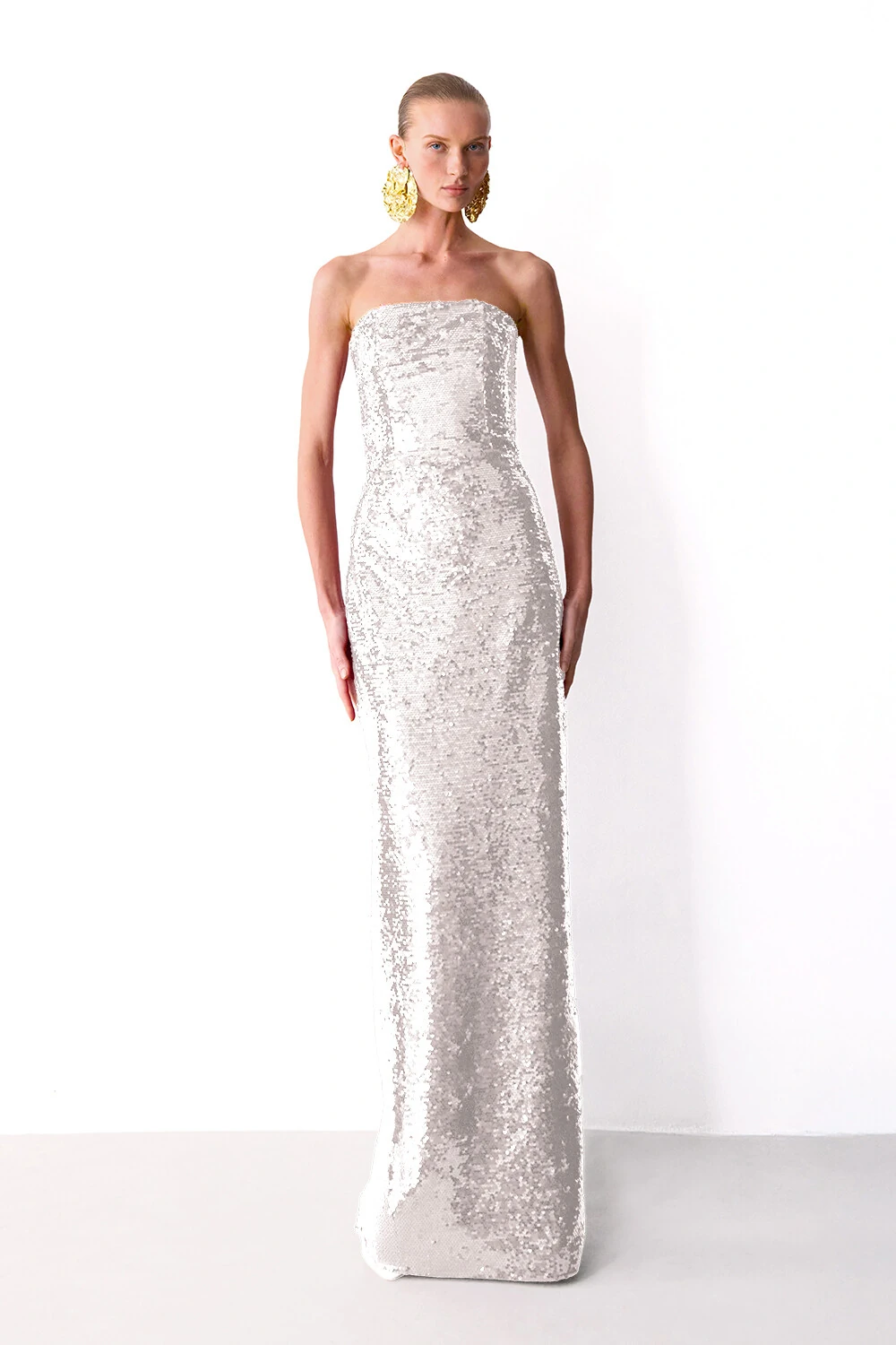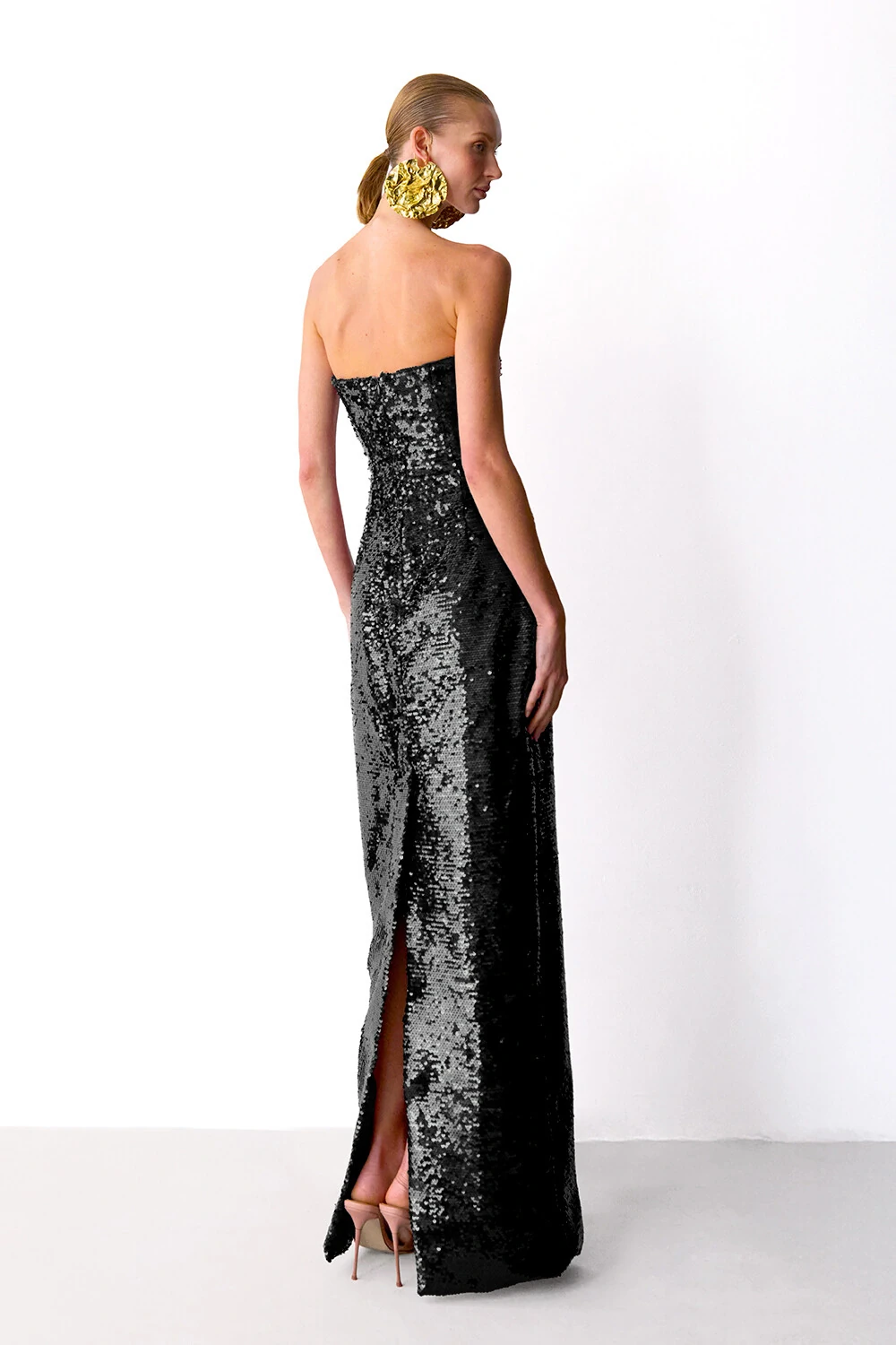 Vestido longo em paete, com decote reto tomara que caia e saia reta com fenda nas costas.