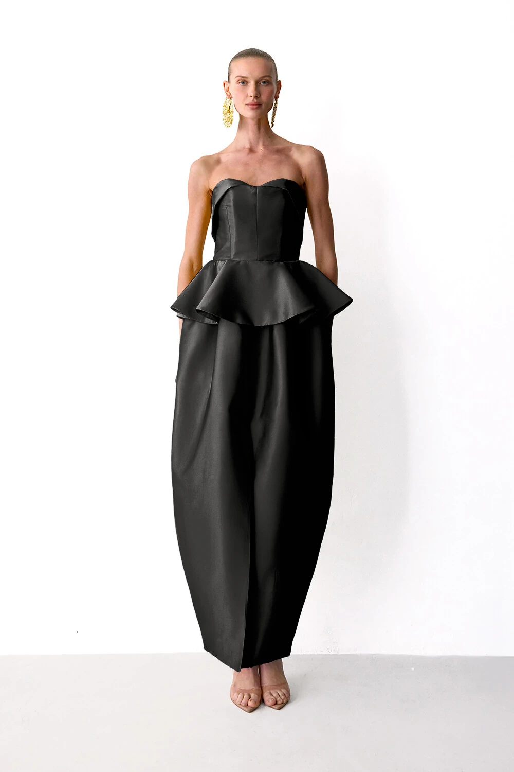 Vestido longuete em tafetá com corpete com decote elevemente coracao e detalhe em moulage. Cintura com peplum gode e saia balao com fenda frontal.