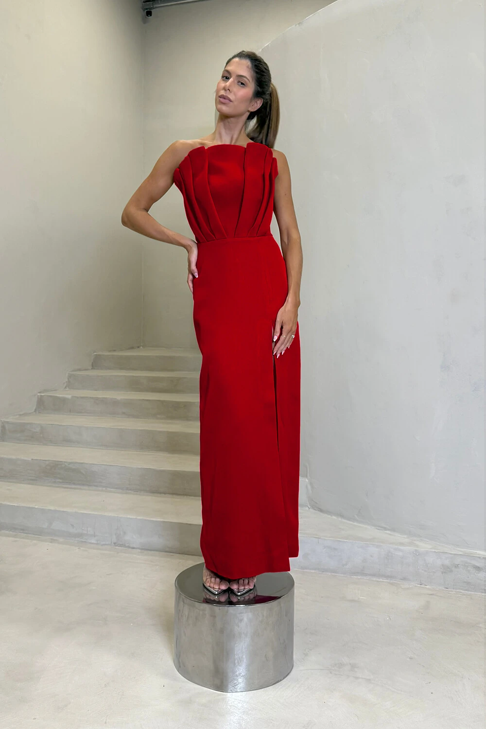 Vestido em crepe com toque mácio, tem um corpete com decote tomara que caia e moulage com formato de pétala. Saia longa reta com fenda alta frontal.