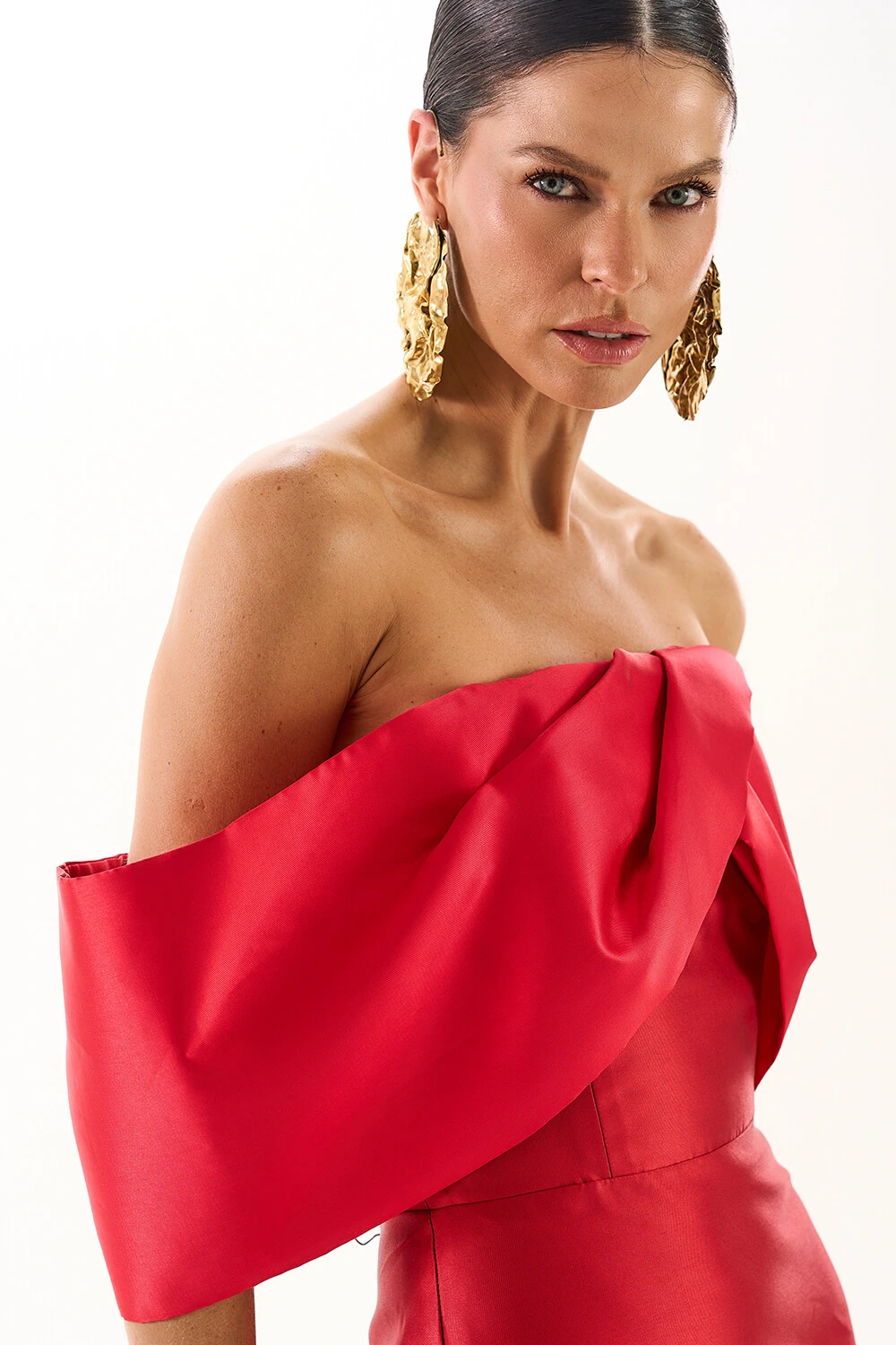 Vestido confeccionado em zibeline, com corpete decote tomara que caia com laçadas que formam mangas com um caimento estruturado. Saia reta com fenda nas costas.Todo forrado internamente e com elástico interno para melhor sustentação. Fechamento com zíper invisível.