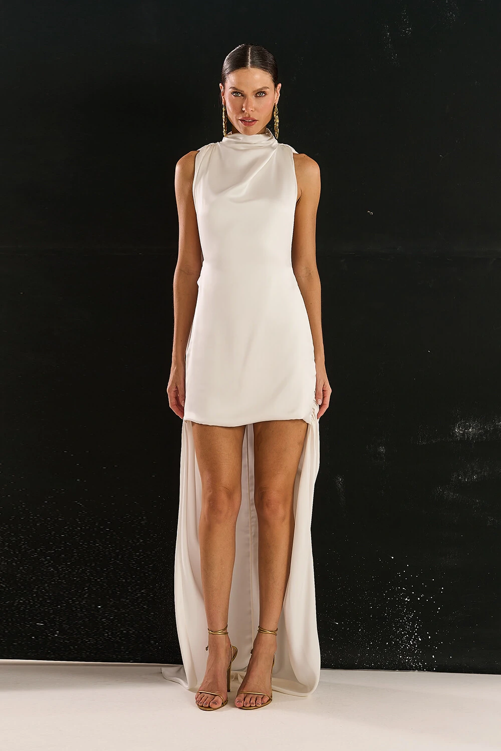 Vestido confecionado em cetim, com caimento leve e fluído. É formado por uma gola levemen te alta, shape da frente reto e justo ao corpo, com decote baixo nas duas laterais e faixa nas costas para sustentação.