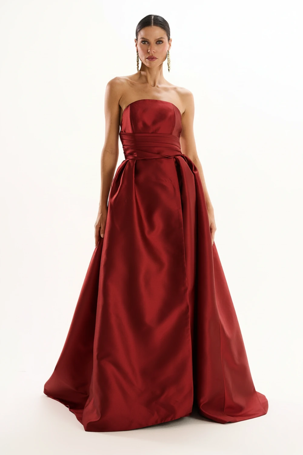 Vestido confecionado em zibeline, com decote arqueado tomara que caia. Corpete com moulage em pregas na diagonal, frente e costas. Saia com volume amplo, pregas nas laterais e fenda traspassada na frente. Leve cauda nas costas. Todo forrado internamente e com elástico interno para melhor sustentação. Fechamento com zíper invisível.