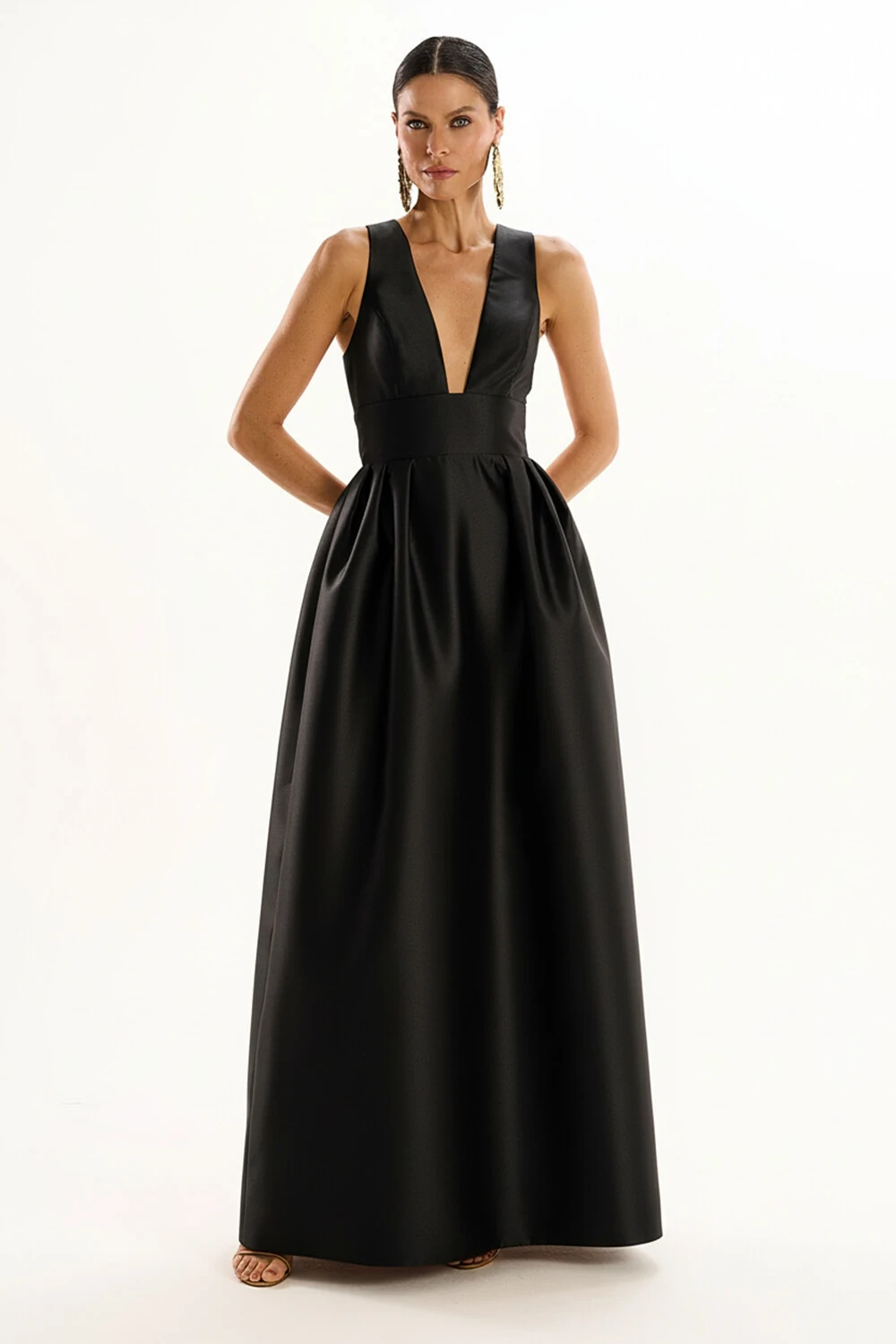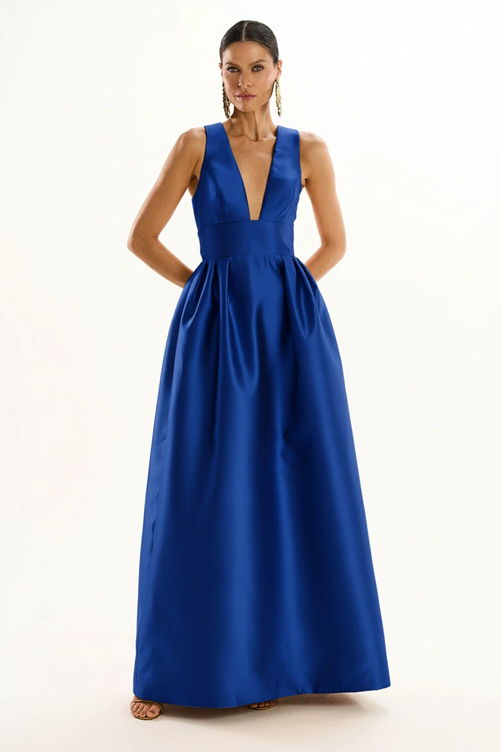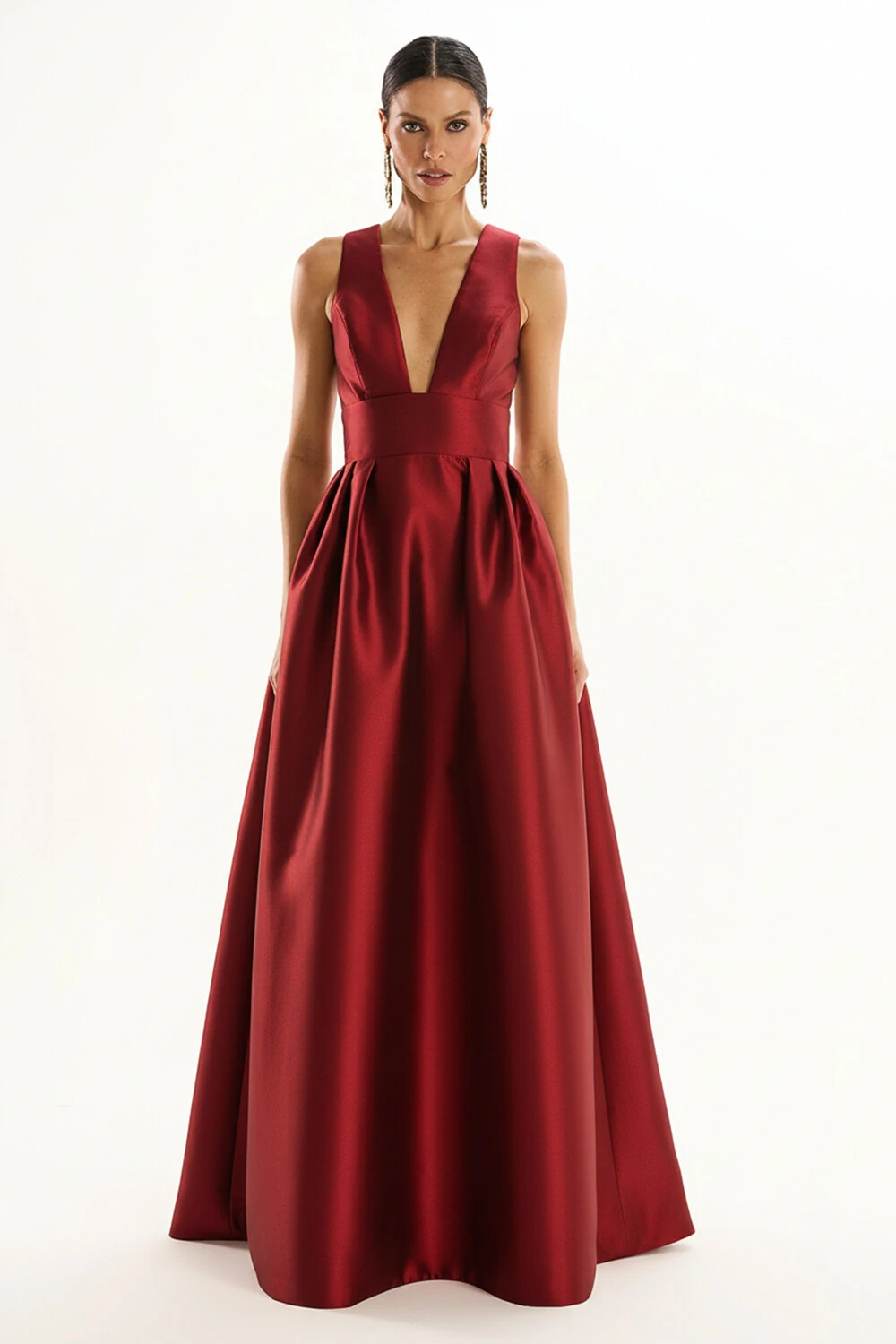 Vestido confecionado em zibeline, com decote arqueado tomara que caia. Corpete com moulage em pregas na diagonal, frente ecostas. Saia com volume amplo, pregas nas laterais e fenda traspassada na frente. Leve cauda nas costas. Todo forrado internamente e com elástico interno para melhor sustentação. Fechamento com zíper invisível.