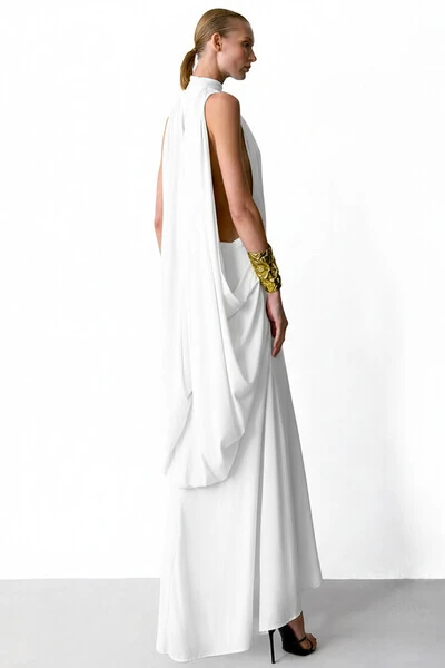 Vestido longo em malha super leve a ajustável ao corpo, com parte superior com gola alta e franzido nos ombros, Saia com shape reto na frente e caimento balone nas costas, com laterais vazadas.