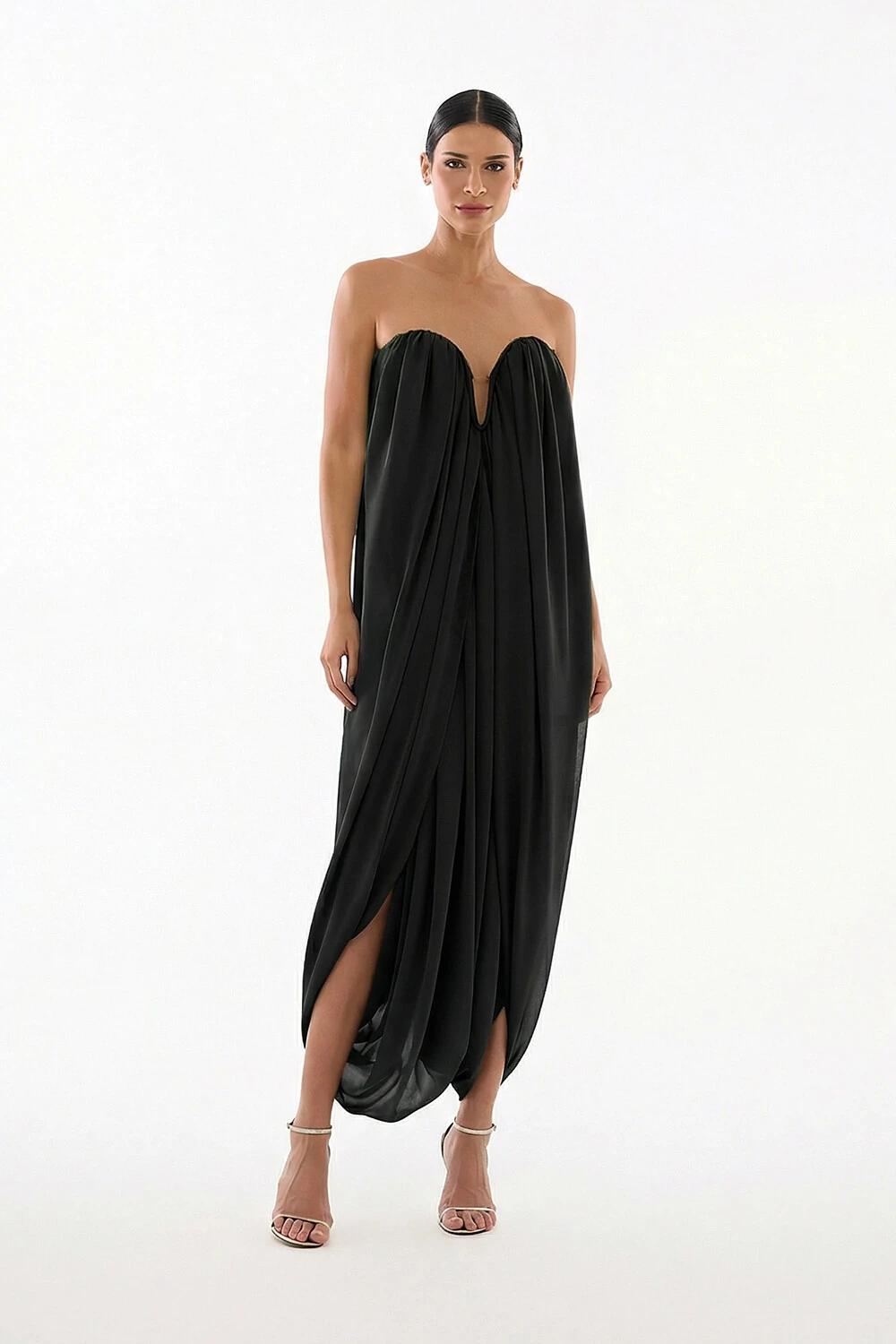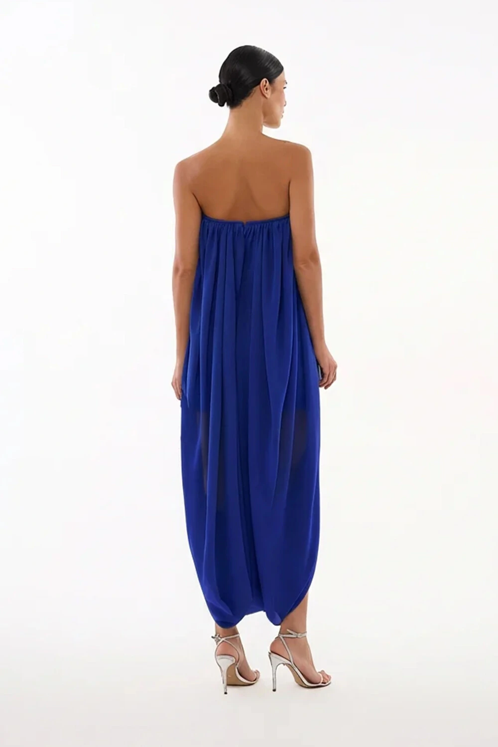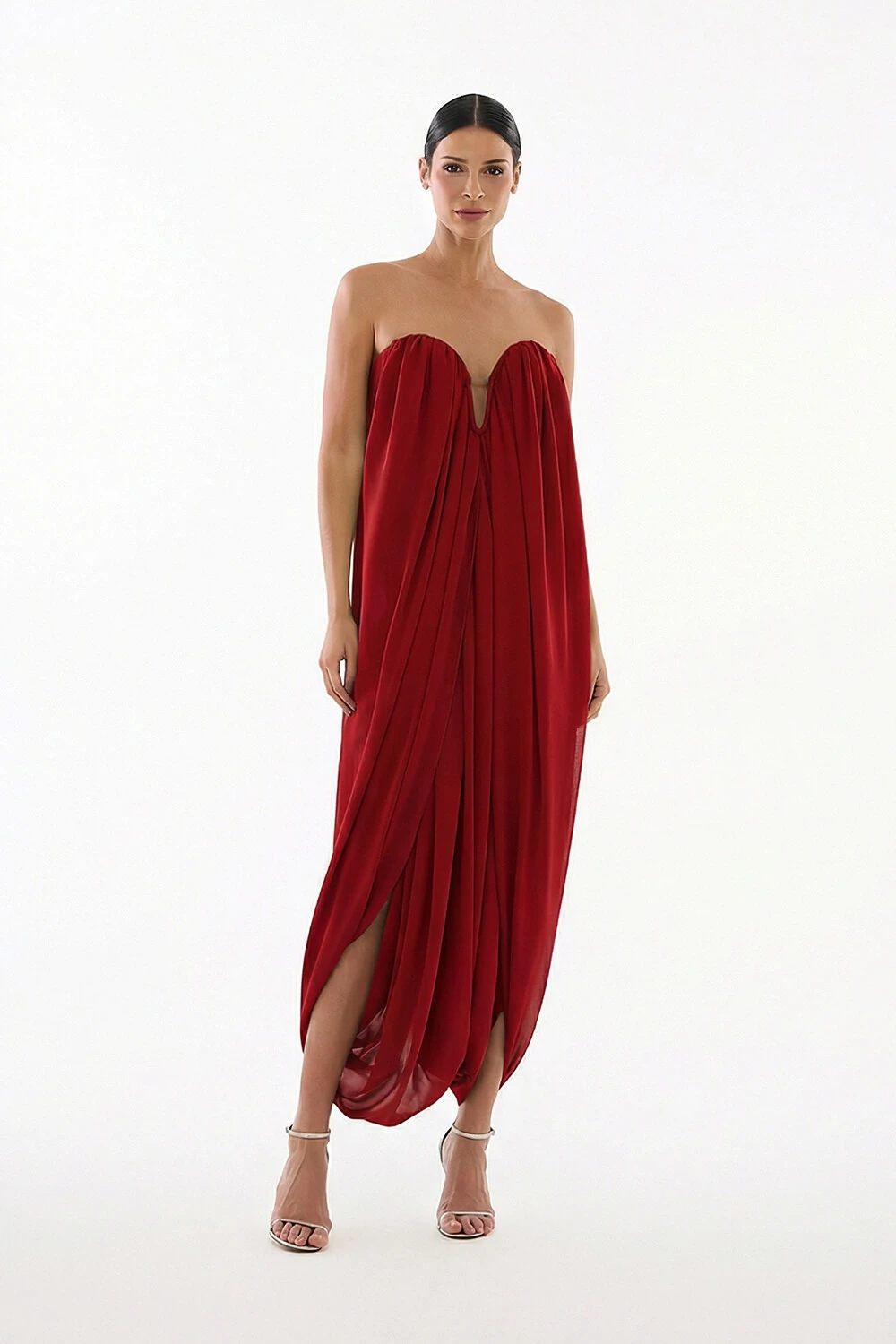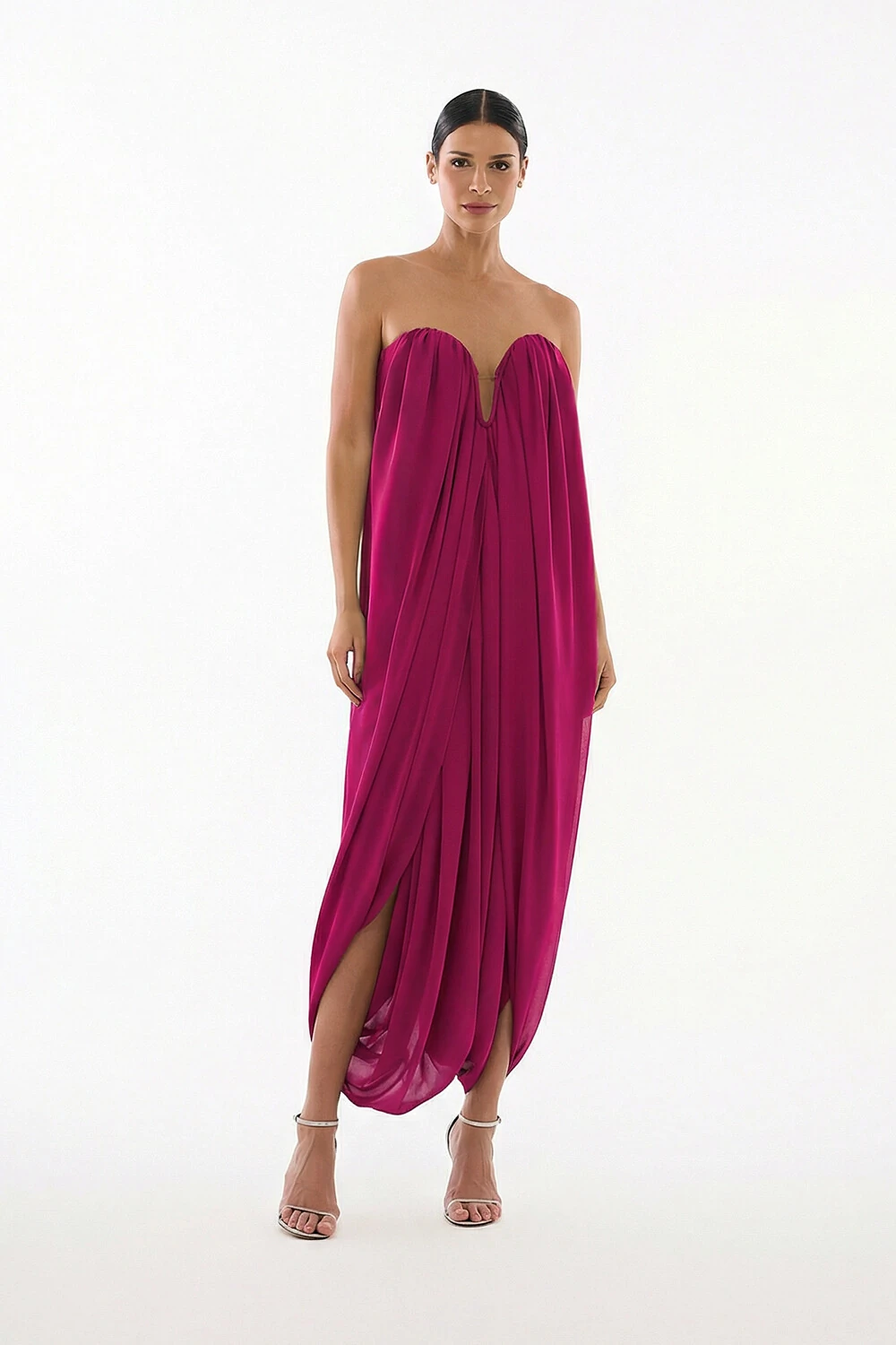 Macacão confeccionado em georgete, com decote coração estruturado e contornado com vivo. Caimento franzido no decote e solto ao corpo. Fechamento com zíper invisível reforçado e todo forrado internamente mais elástico interno para sustentação.