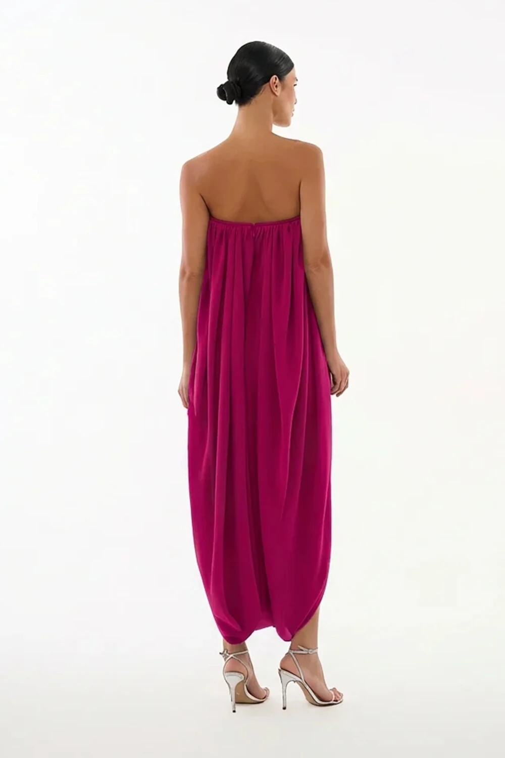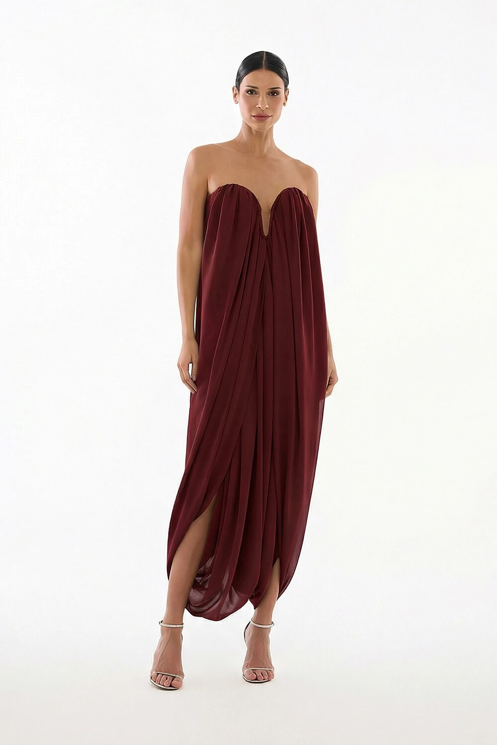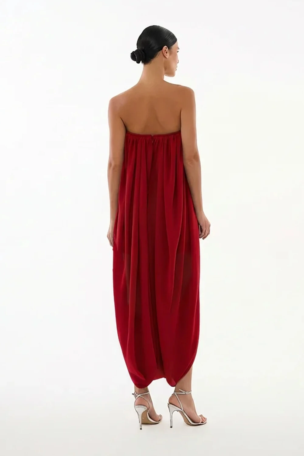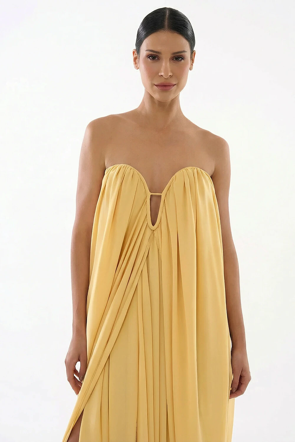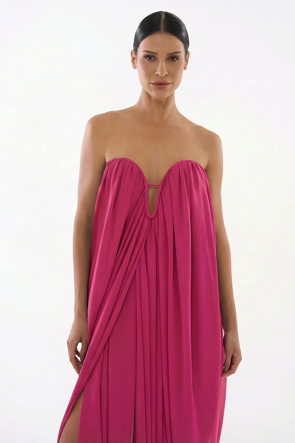 Macacão confeccionado em georgete, com decote coração estruturado e contornado com vivo. Caimento franzido no decote e solto ao corpo. Fechamento com zíper invisível reforçado e todo forrado internamente mais elástico interno para sustentação.
