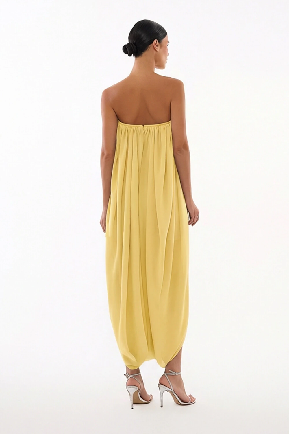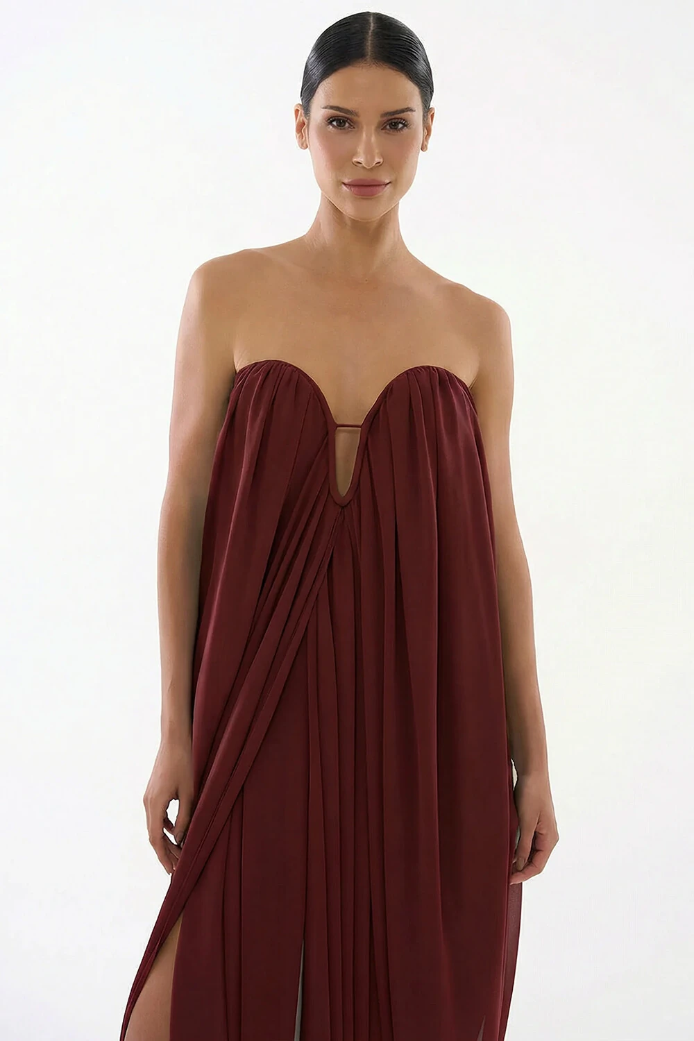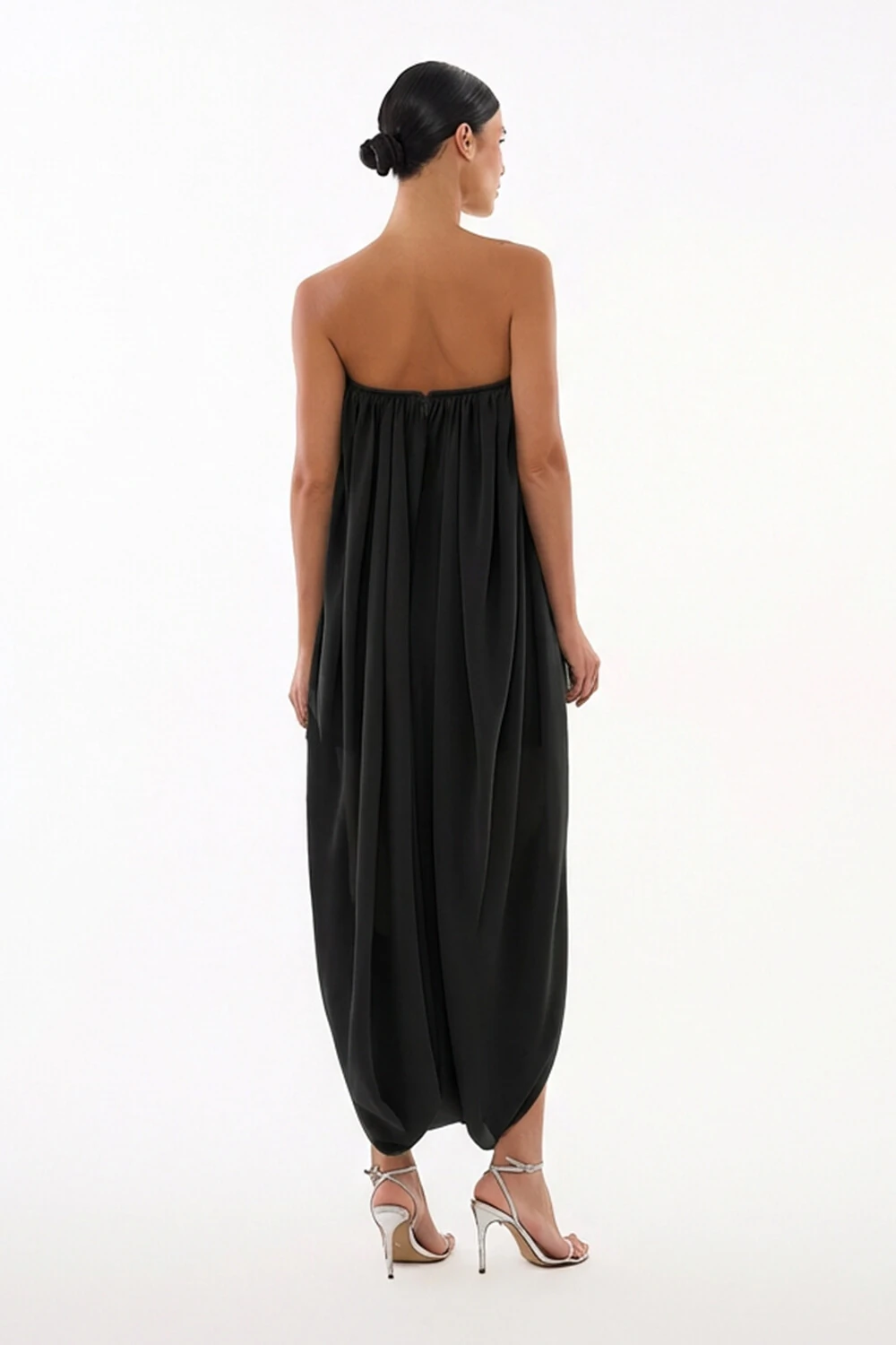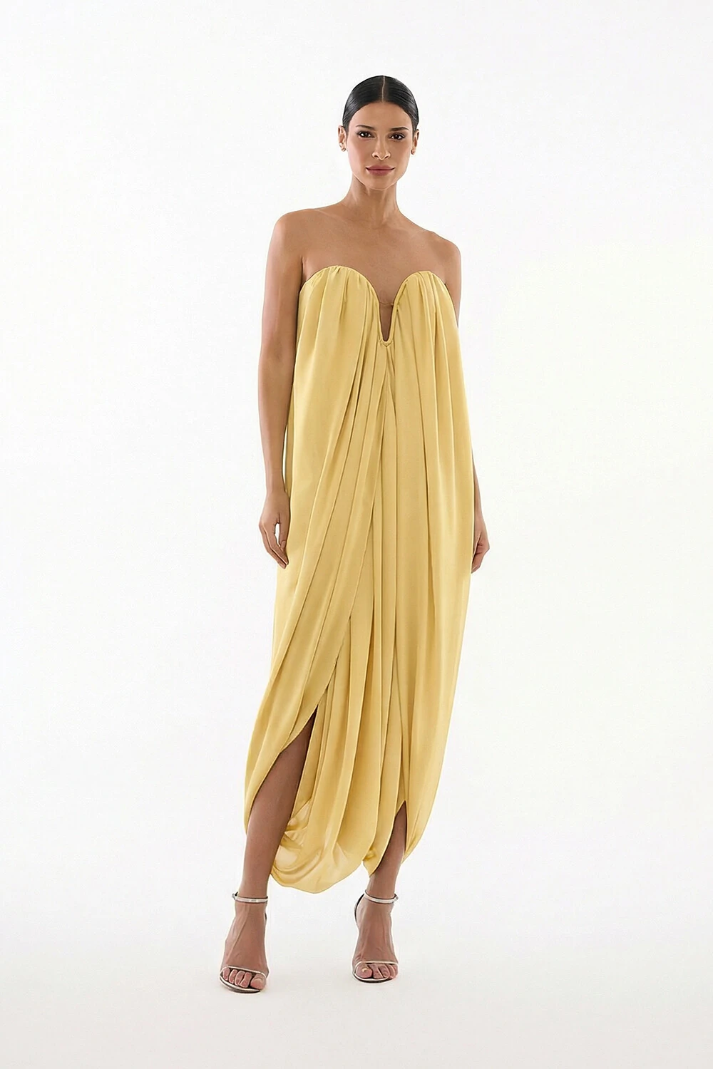 Macacão confeccionado em georgete, com decote coração estruturado e contornado com vivo. Caimento franzido no decote e solto ao corpo. Fechamento com zíper invisível reforçado e todo forrado internamente mais elástico interno para sustentação.