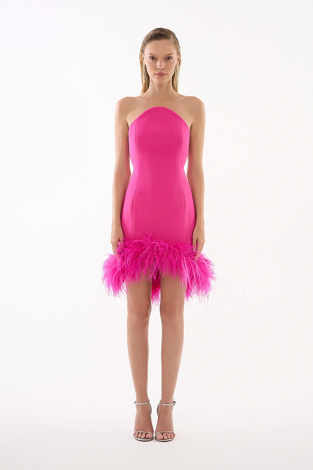 Vestido confeccionado em crepe, com corpete decote tomara que caia e saia curta com aplicação de plumas na barra. Fechamento com zíper invisível reforçado e todo forrado internamente.