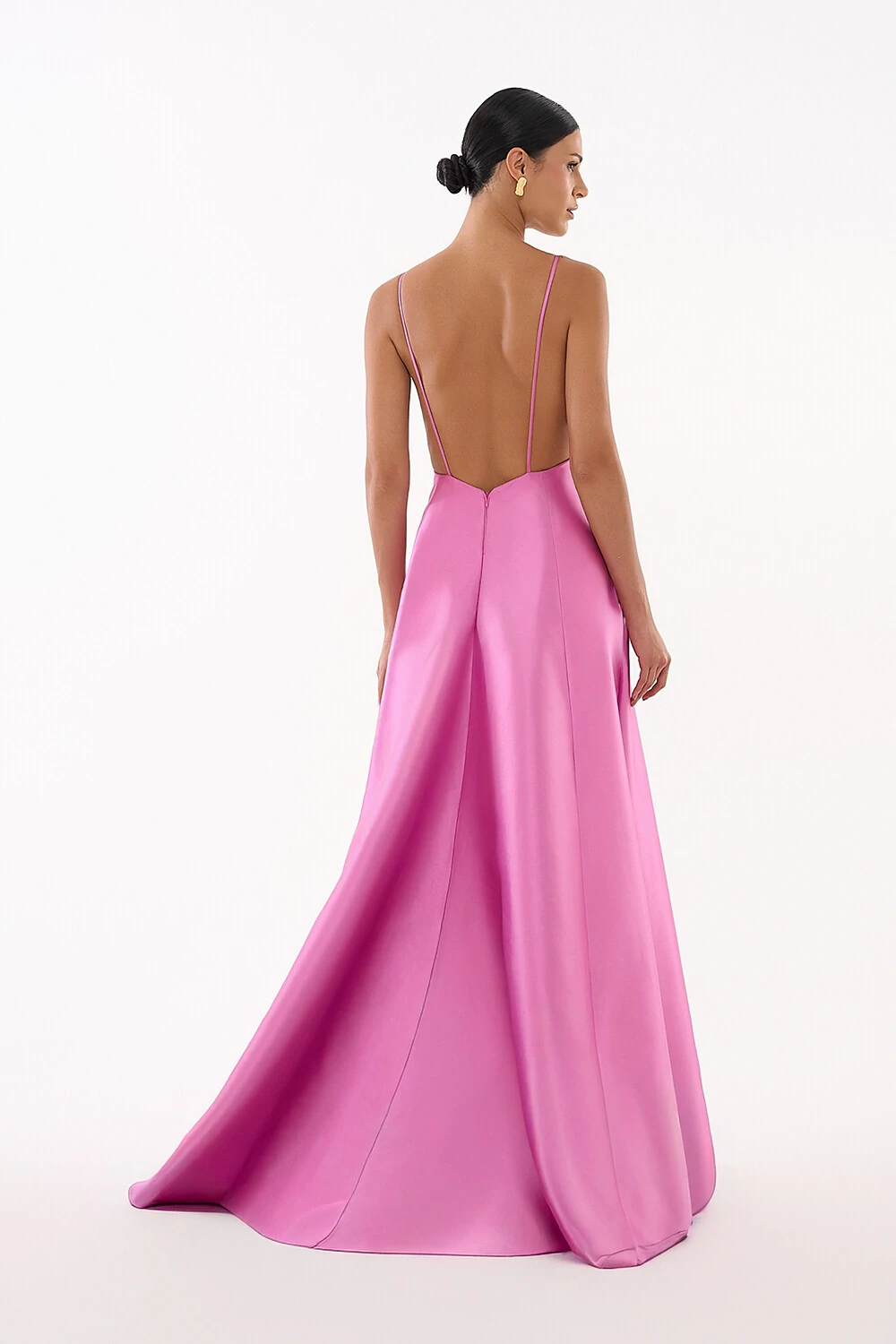 Vestido confeccionado em zibeline, com frente única com alças finas deixando as costas com decote baixo e saia com pregas profundas na frente. Fechamento com zíper invisível reforçado e todo forrado internamente.