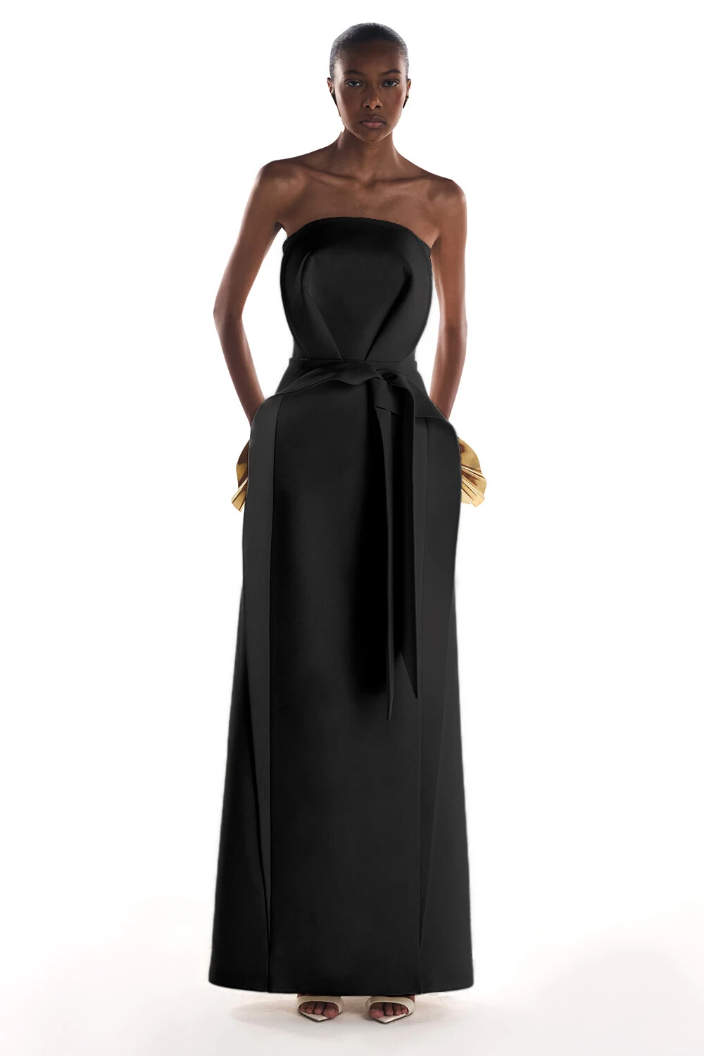 O vestido Antonia é confeccionado em zibeline, com corpete em decote reto e tomara que caia e uma “pétala” estruturada aplicada no centro do busto, formando uma volumetria única. A saia com shape reto tem um detalhe de moldura, formada por duas faixas que dão amarração e uma nesga nas costas. Fechamento com zíper invisível nas costas. Uma peça com desenho completamente arquitetônico e volumetrias únicas. Ideal para o seu momento especial.