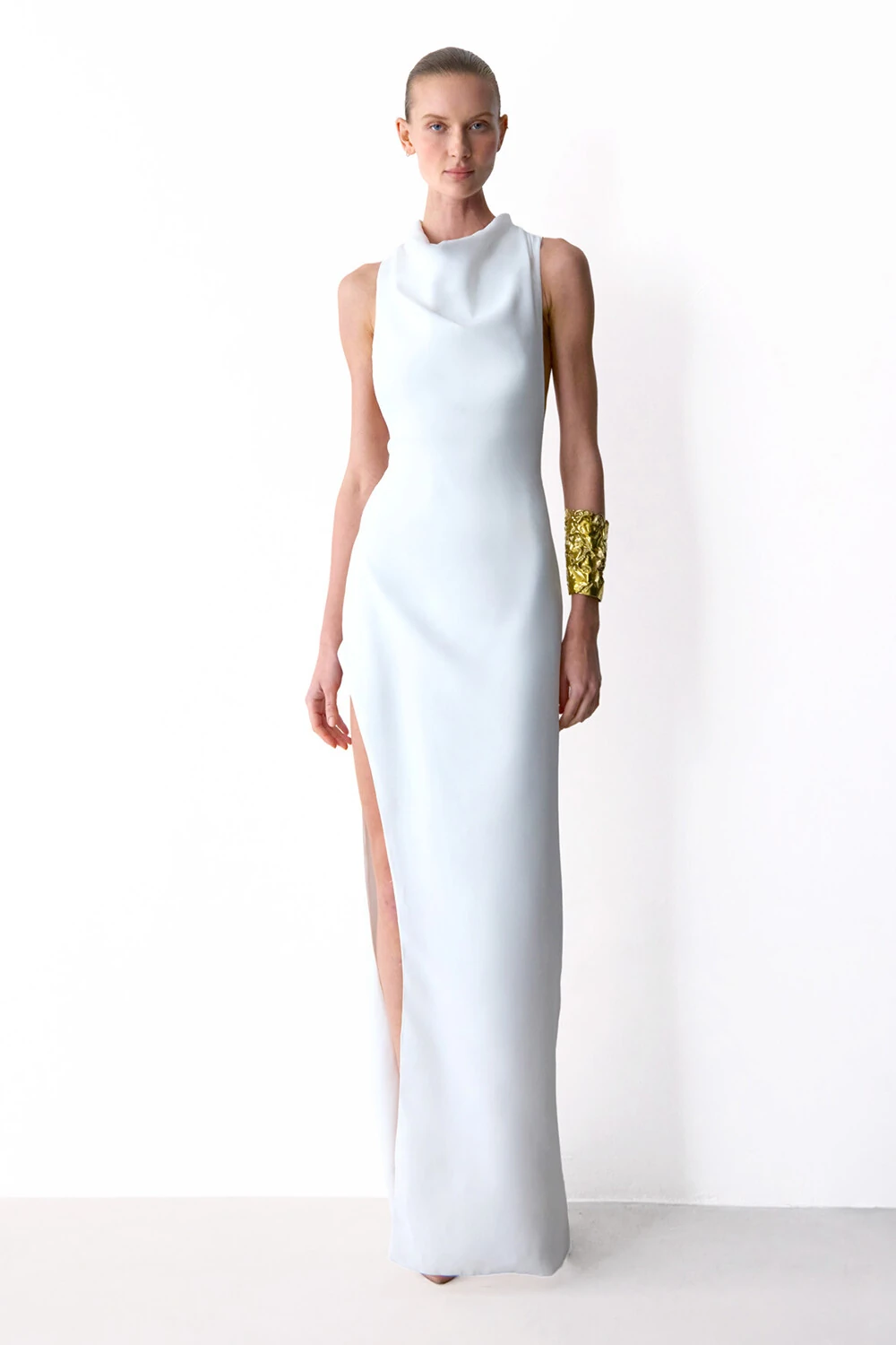 Vestido longo e shape reto, confeccionado em crepe patou com gola ampla em efeito degage. Fenda alta na lateral.