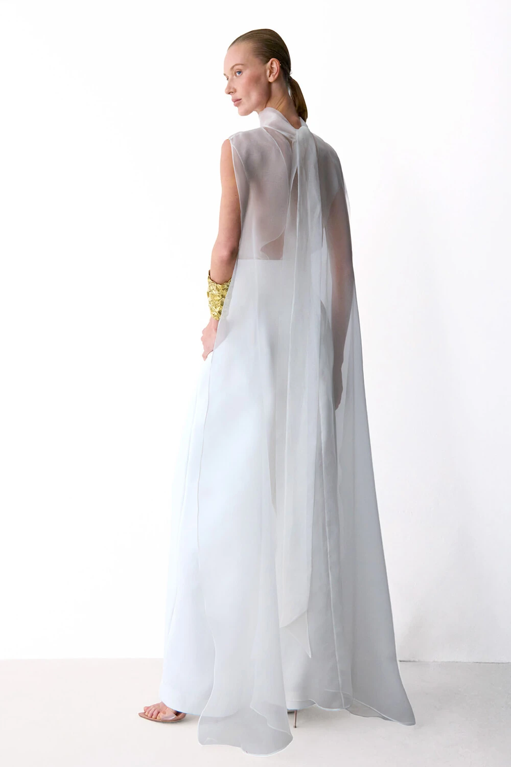 Top em organza de seda com shape amplo e fluído, com uma capa e faixa para amarracao nas costas.