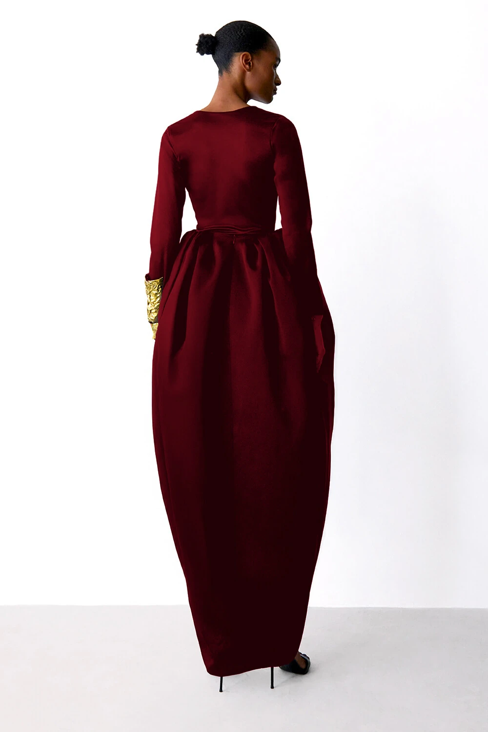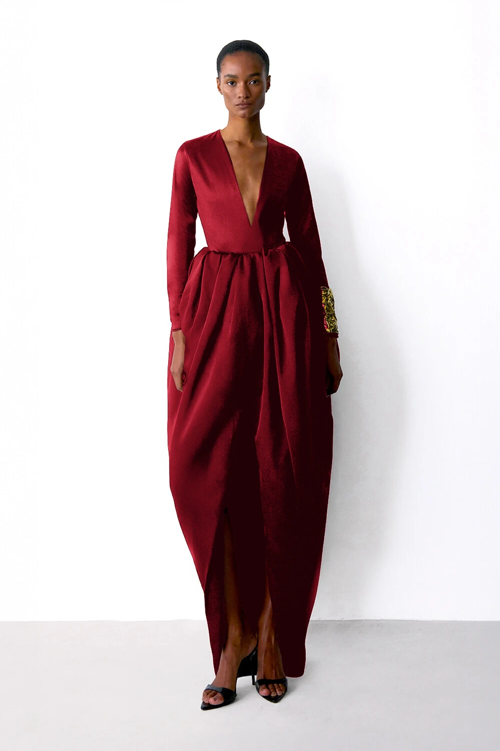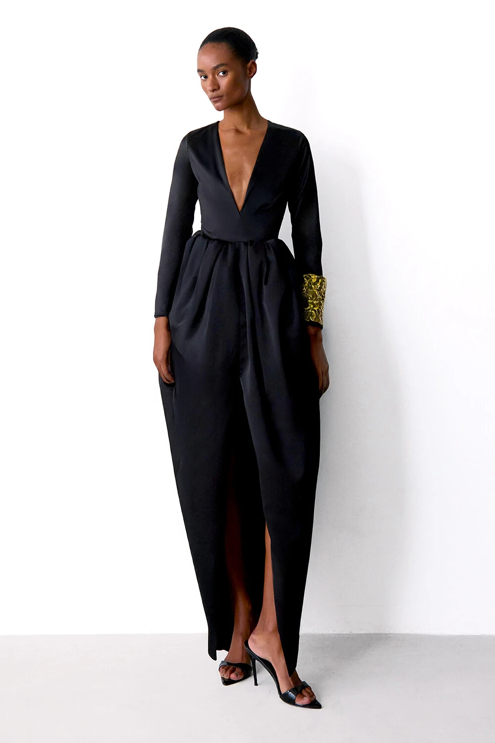 Body em malha com um leve brilho, decove V profundo e manga longa.