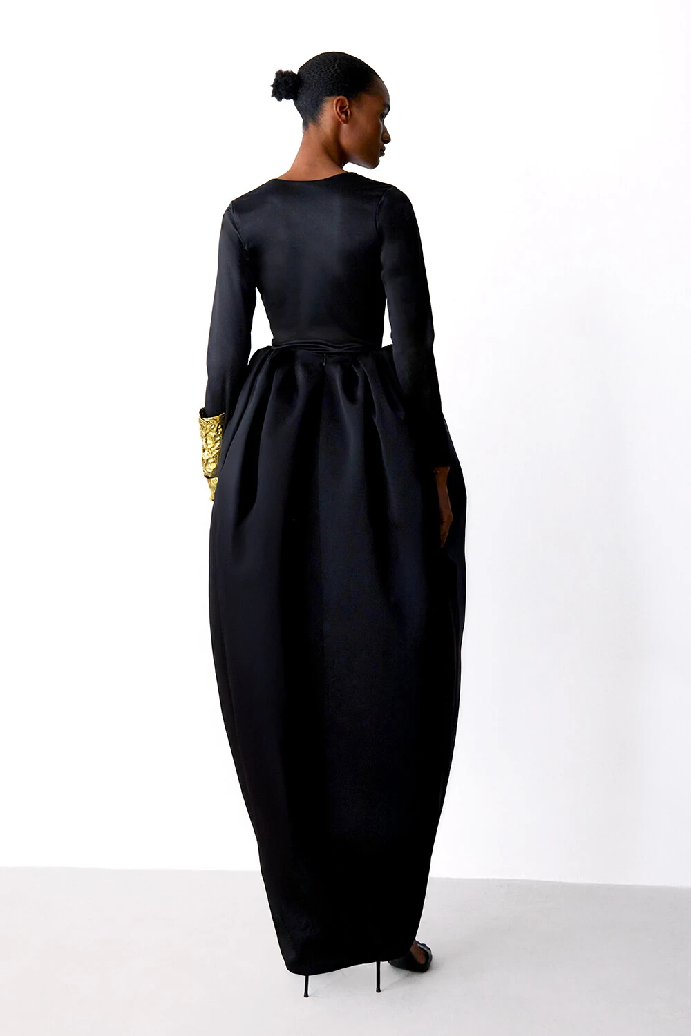 Saia Em crepe de seda com shape abaulado, formada por várias pregas na cintura e uma fenda frontal.