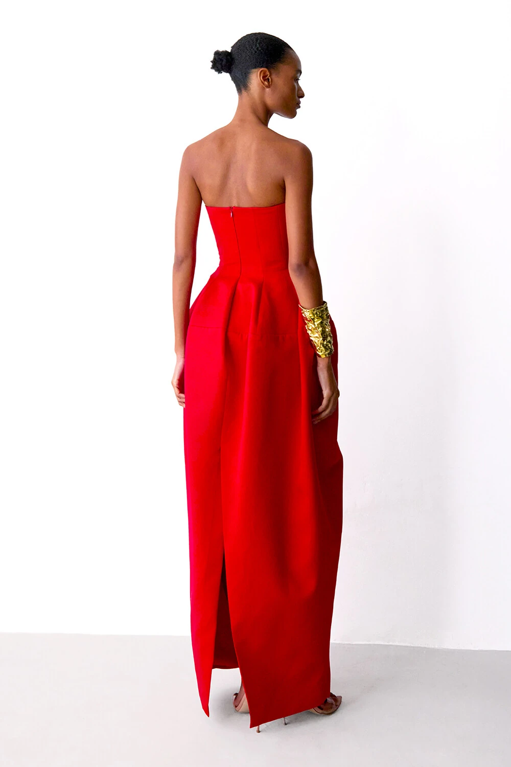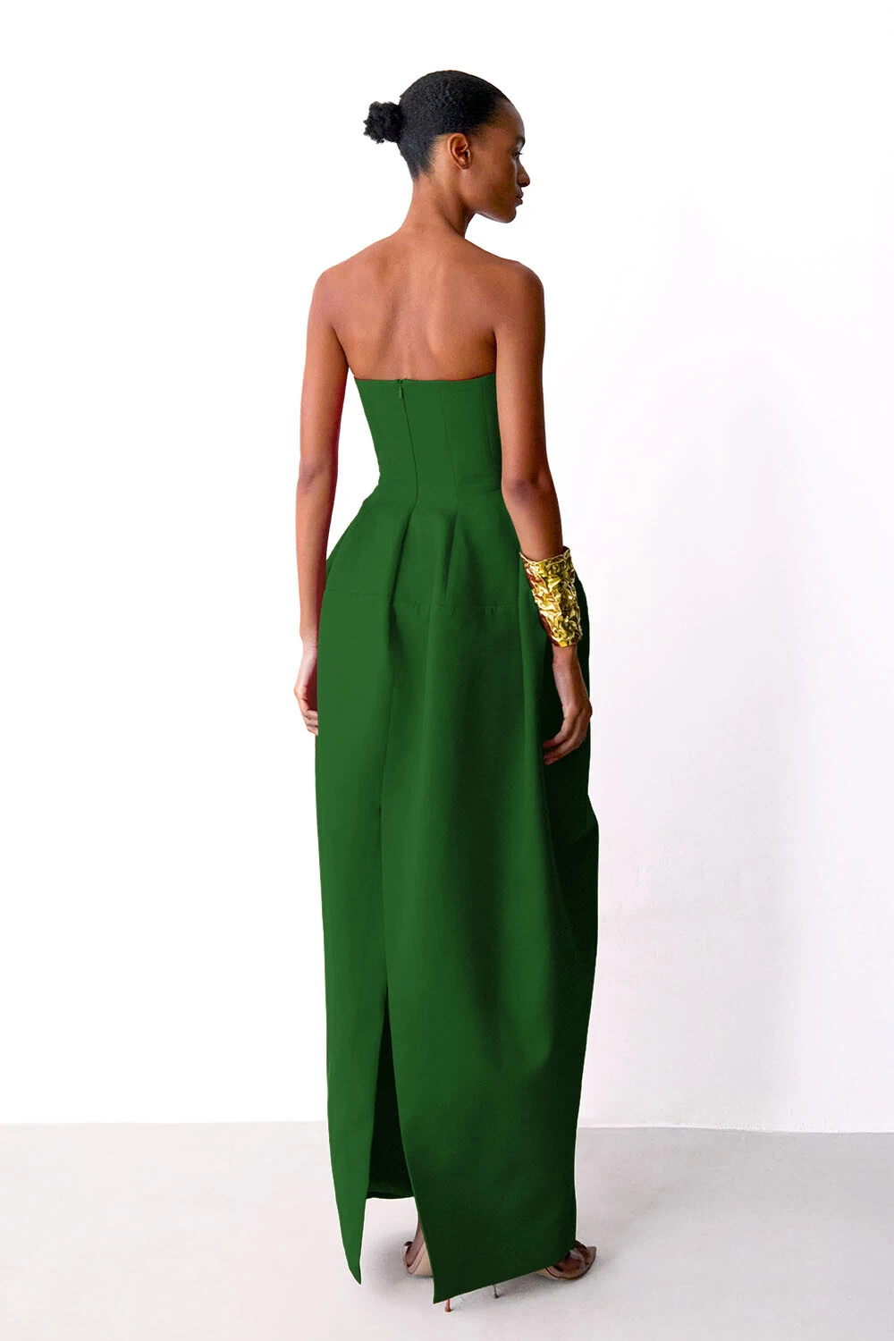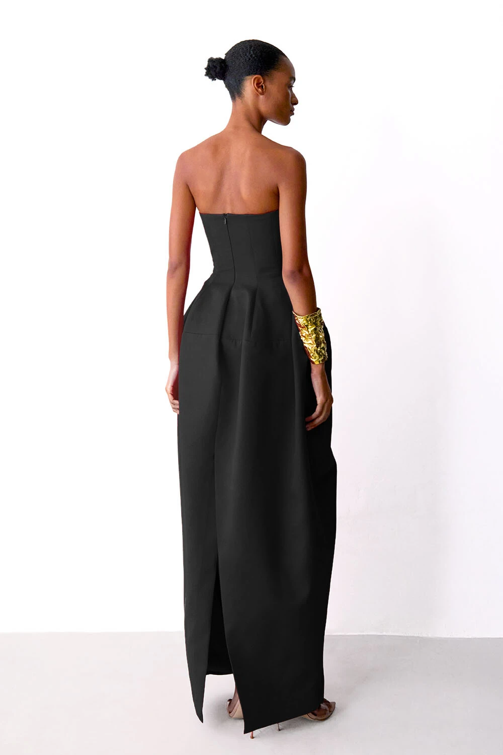 Vestido longo confeccionado em crepe com toque super macio, com decote tomara que caia e shape de saia abaulado.