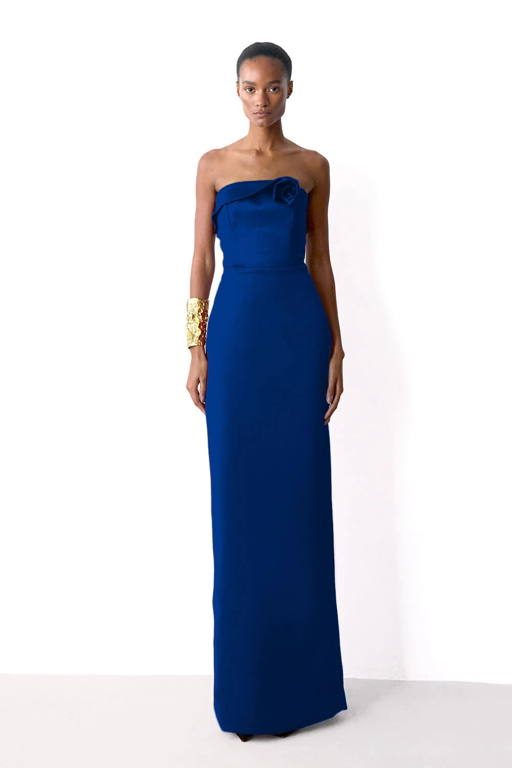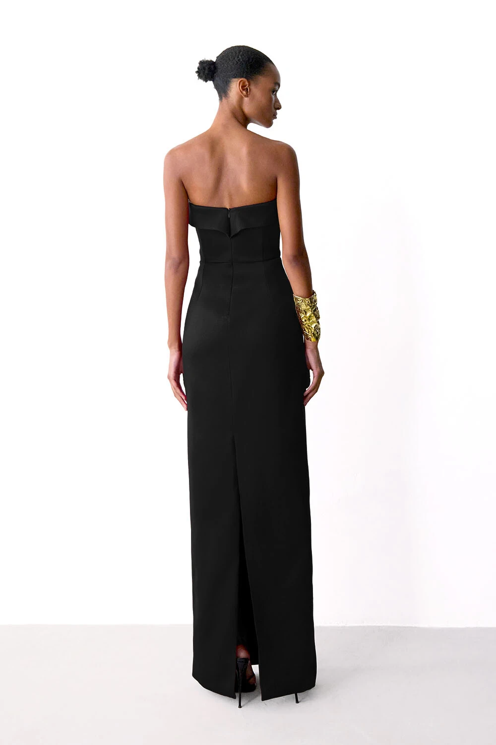 Vestido confeccinado em crepe com toque super macio, tem um corpete tomara que caia com moulage de uma flor e saia reta com fenda nas costas.